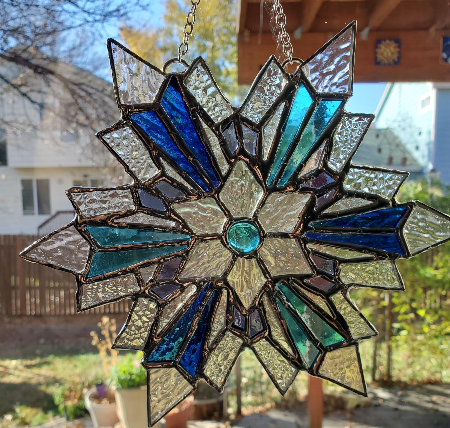 This piece comes with 2 loops and a chain for hanging in your window, or on your wall, or even on your holiday tree!