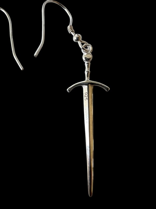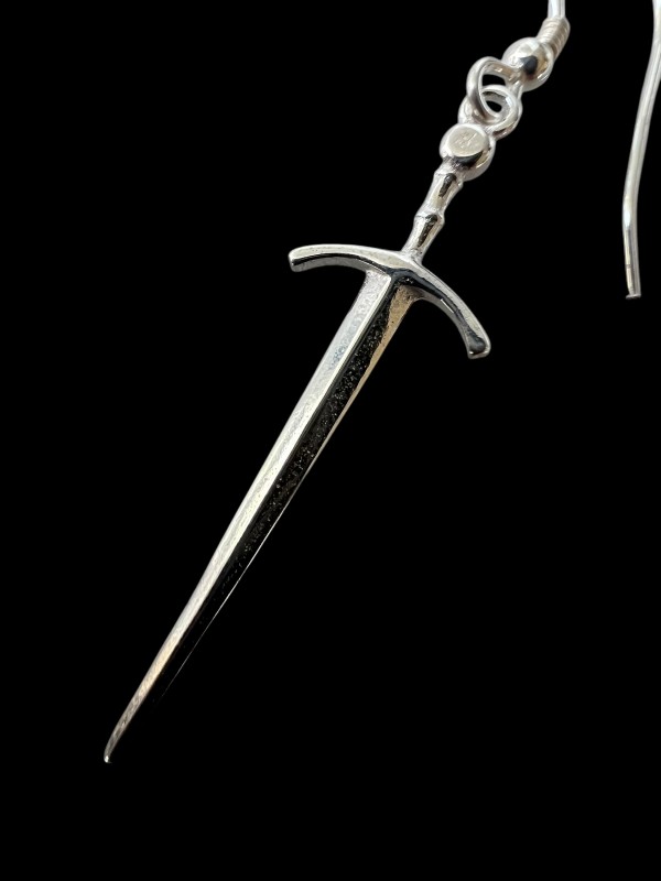 These elegant sword earrings are far less klunky than the usual "weapon" earrings, because they are based on a close modeling of a 14th century sword preserved in the Royal Armouries at Leeds.