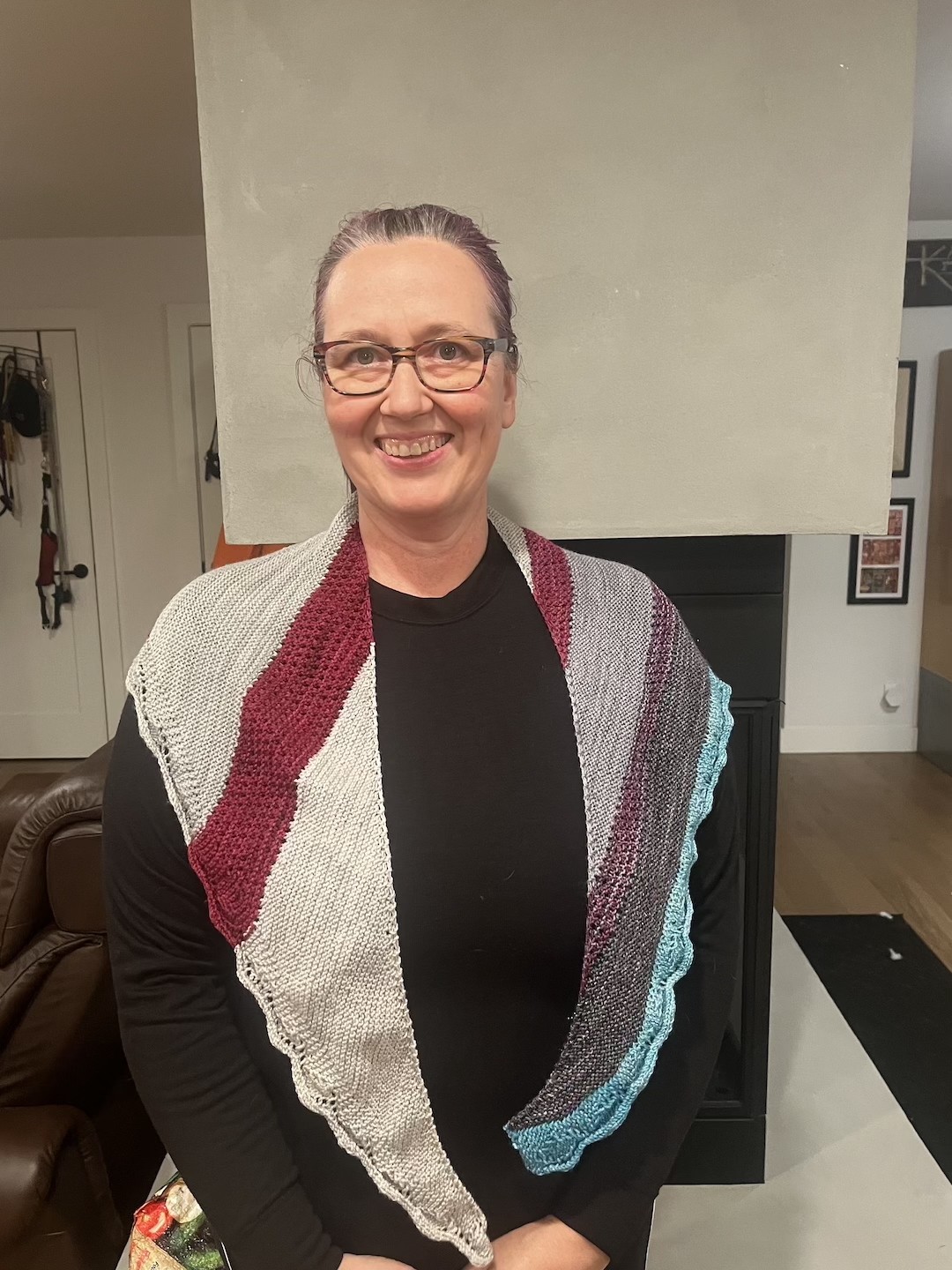 Large Shawl featuring a variety of stitch patterns and cozy colors, with just a hint of sparkle.