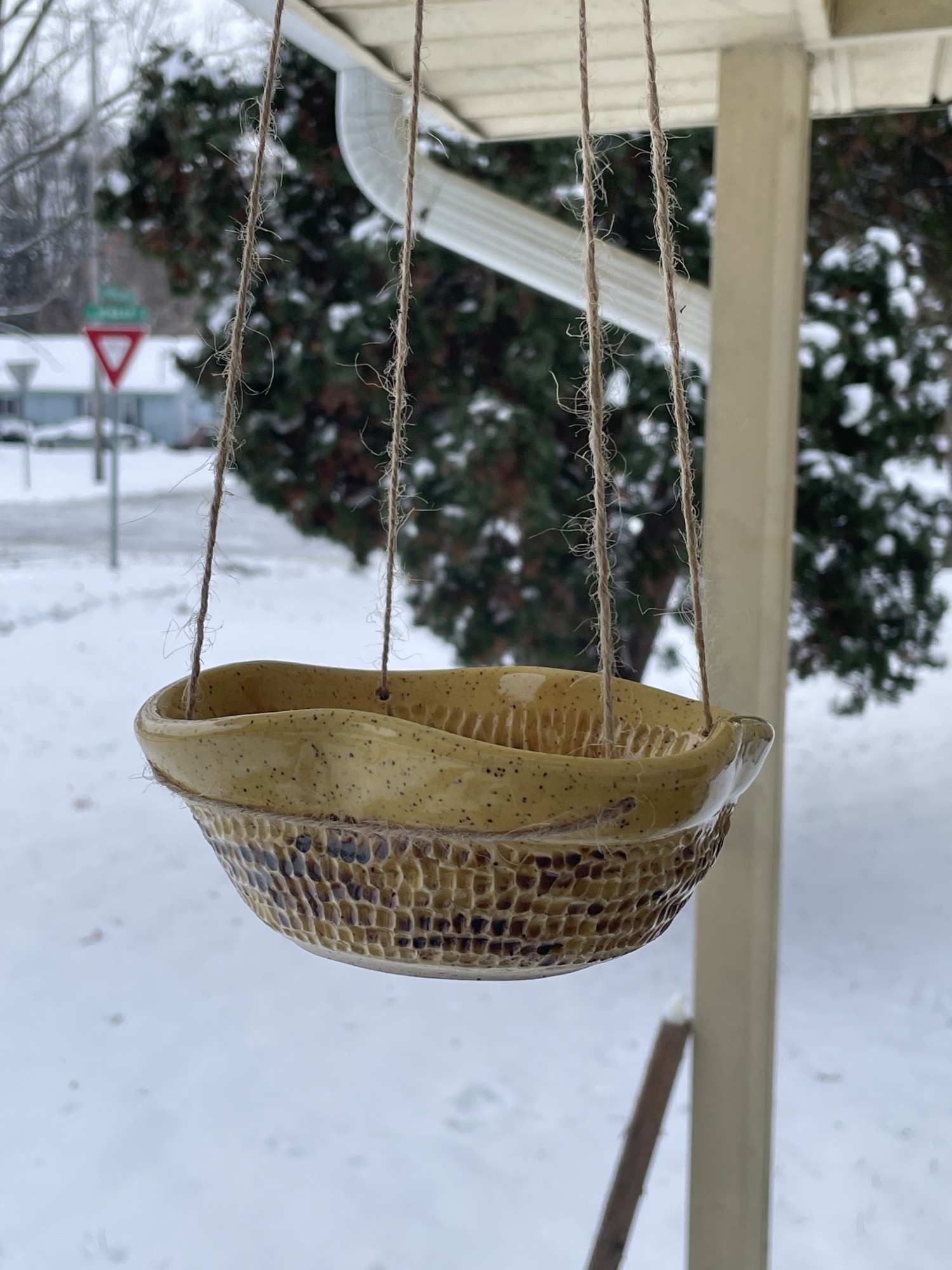 Pretty Sunflower Birdfeeder. Design resembles the inside of a sunflower. This has some weight to prevent it from swinging too much. Can be popped in the dishwasher to clean.