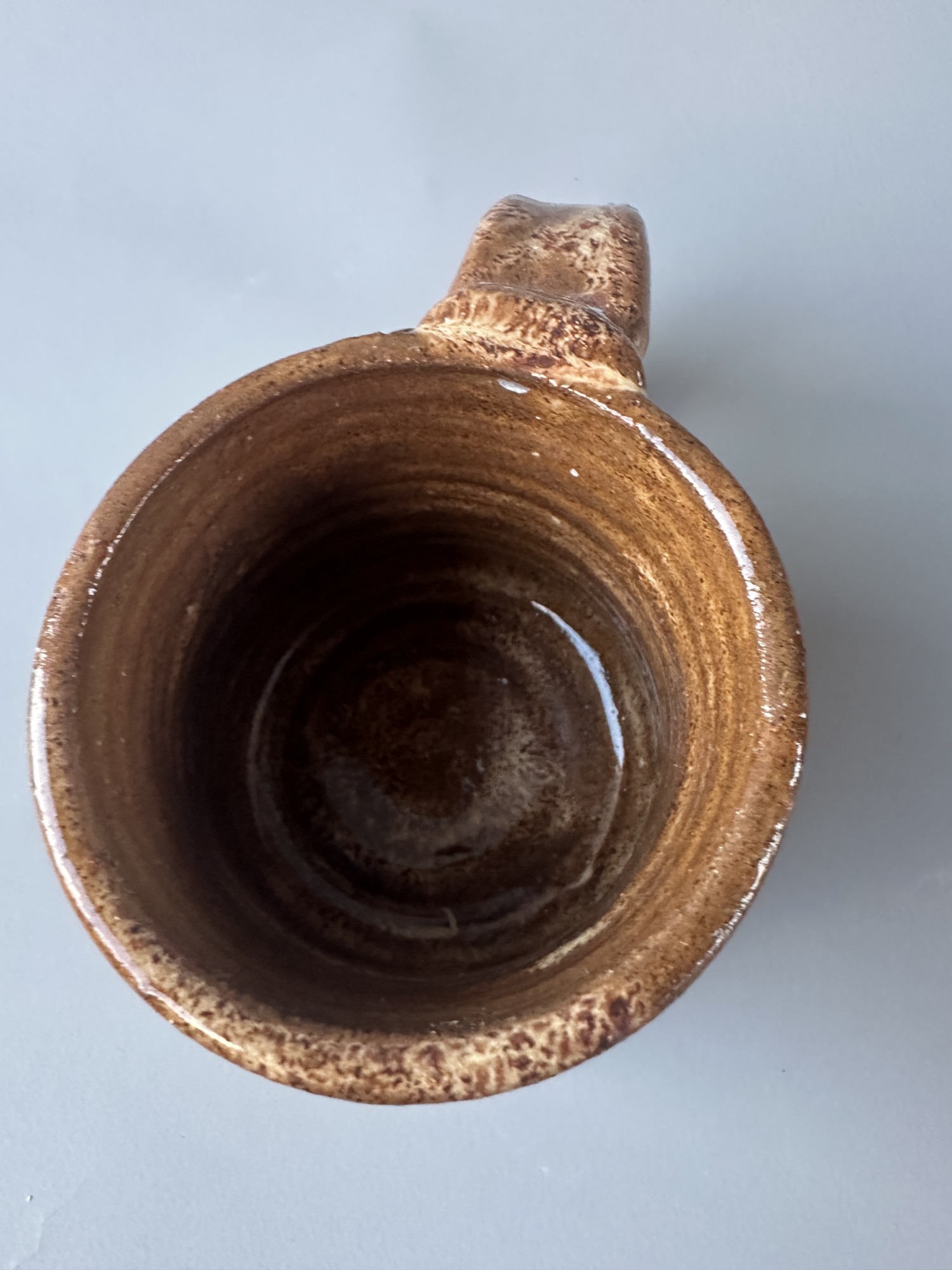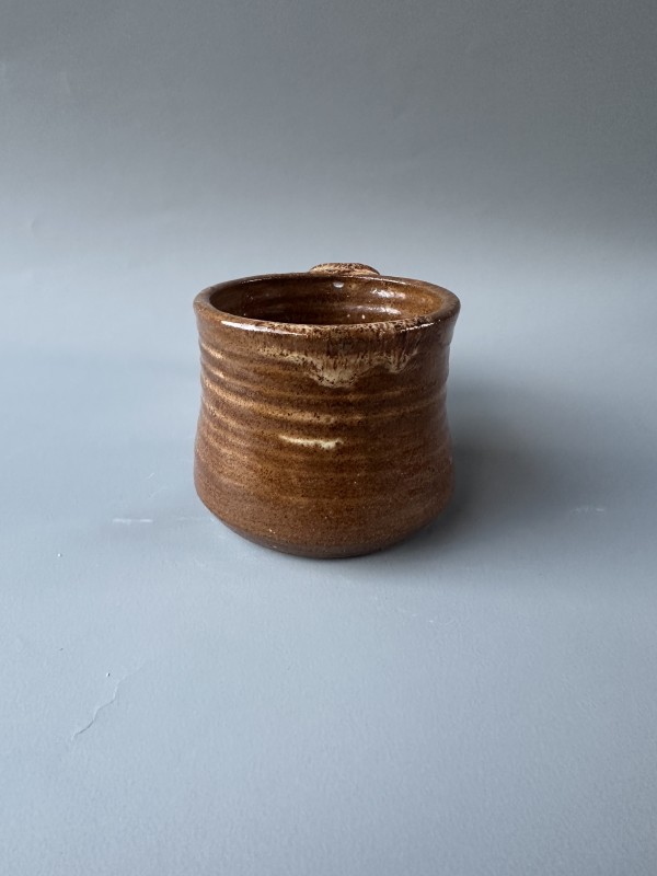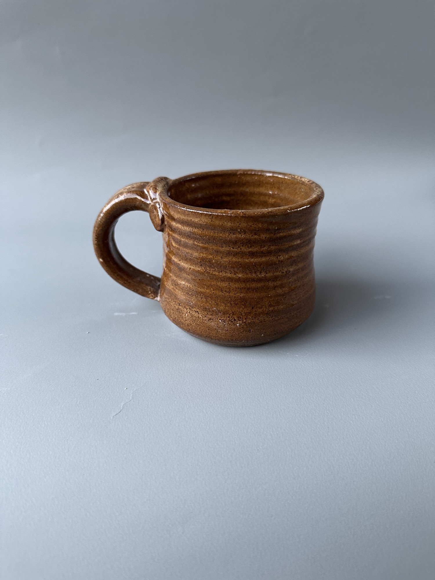 This sturdy handmade cup holds 8 oz. of hot or cold liquid. It is completely handmade, I mixed the foodsafe glaze myself and pulled the handle to be well-balanced in the hand and sturdy.