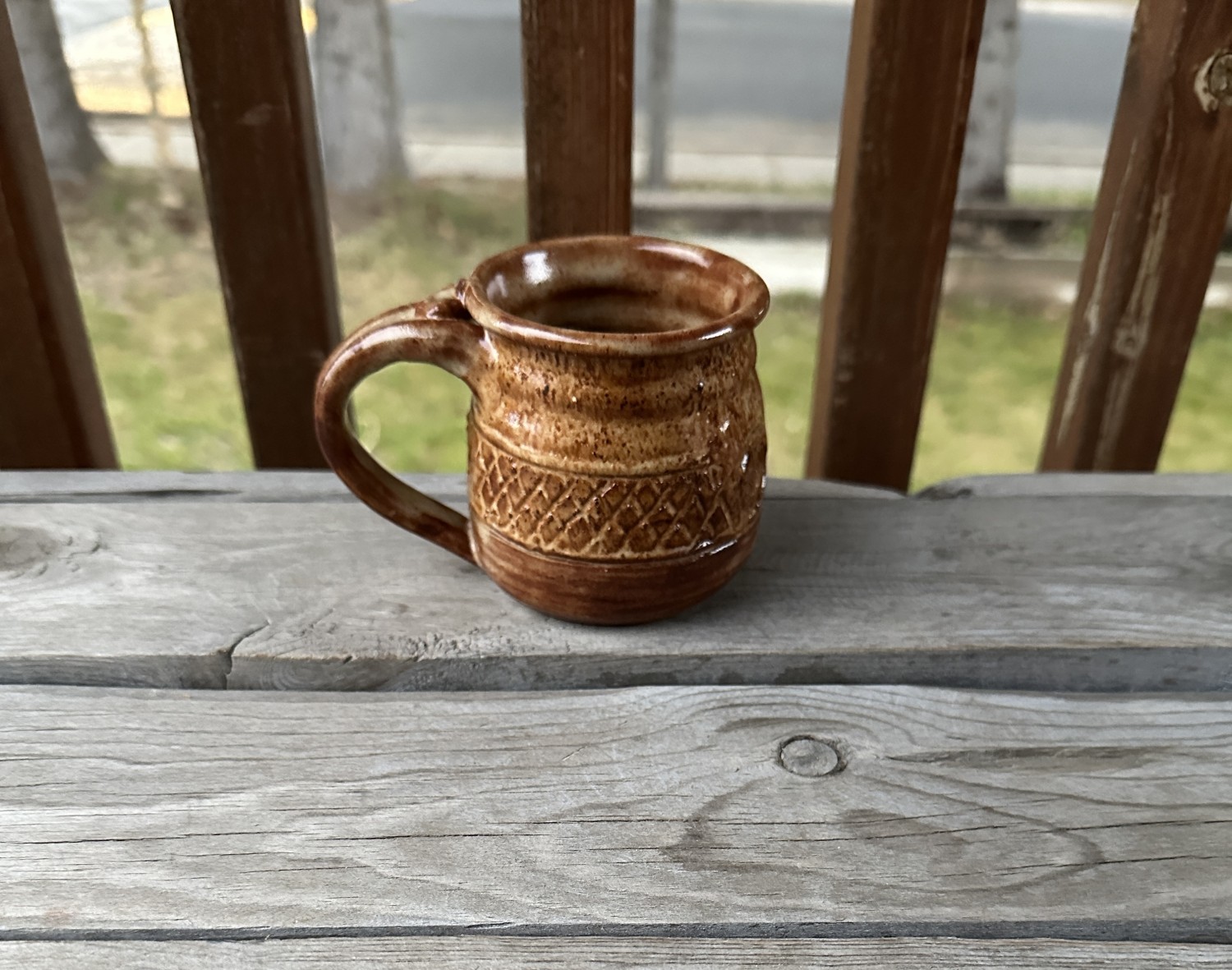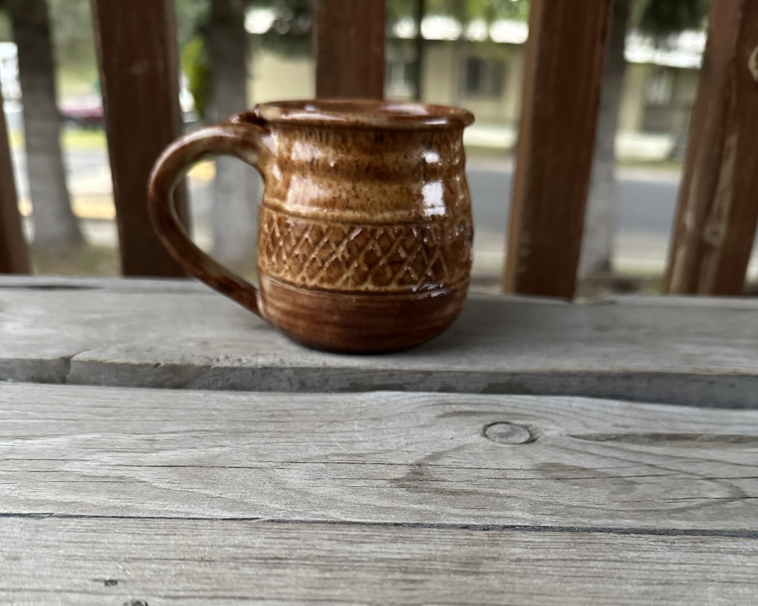 This handmade mug has a generous shape enhanced by its earthy tones, carved decoration, and hand-pulled handle