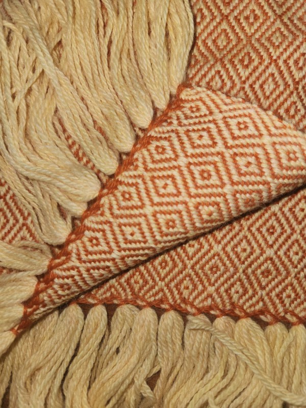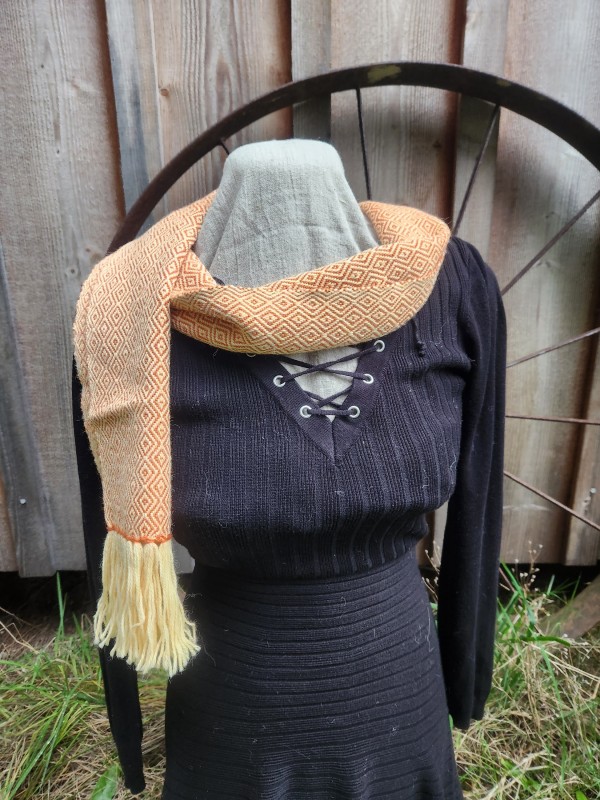 This super soft shawl is handwoven by me, on a traditional floor loom in 100% alpaca. The hypoallergenic alpaca makes for a cozy and elegant addition to your wardrobe. Lemon warp and tangerine weft, leaves lovely yellow fringe on the ends. Woven in a bird’s eye twill pattern. Blanket stitch on the fringe makes a nice decorative edging. The Alpaca, spun in Peru, does shed a bit until it has been worn several times. Slight variations in weave may be seen, due to being handwoven vs machine woven perfection.