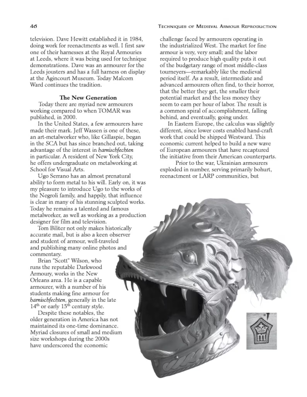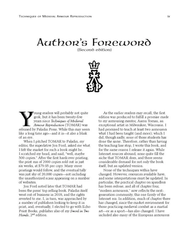 Now-classic 512pp. "how to" text on making medieval armour, with more than 600 photographs! The first edition sold more than 20,000 copies, was Paladin Press's best-selling title for many years, and helped to launch the modern renaissance in medieval armour reproduction. In the words of Anton Antoshyny, “Thank you. Three guys are in fact guilty of this fact [the rise of armourers in Eastern Europe]: J.R.R. Tolkien, John Howe, and you.”