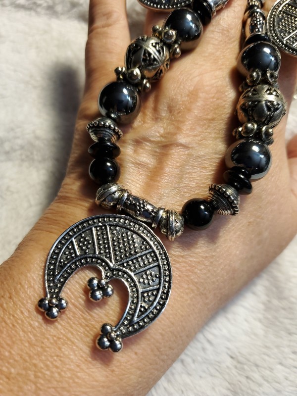 Three Moons LunulaOnyx, Hematite, Tibetan Silver, 20 inches long , One of a kind$ 99, $ 10 shipping