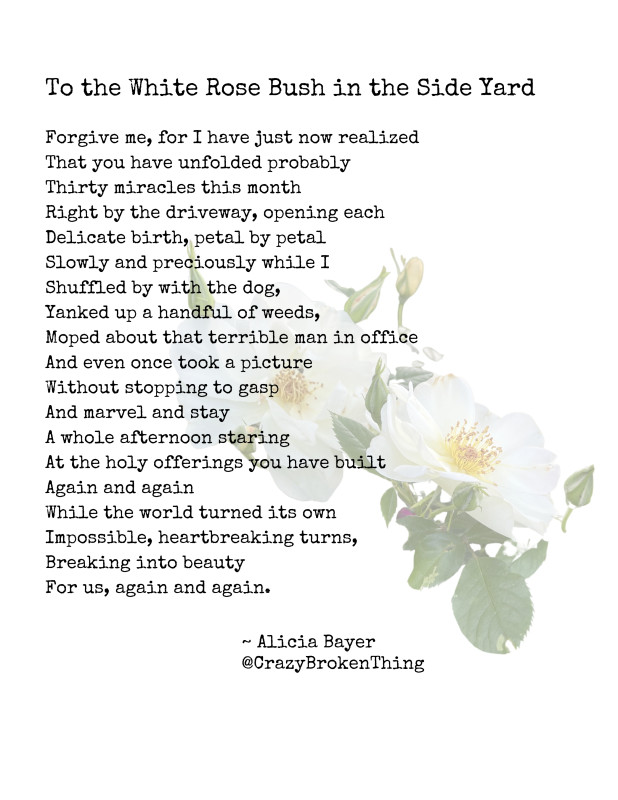 This is an original poem, To the White Rosebush in the Side Yard, by Alicia Bayer, with photography by Alicia Bayer.