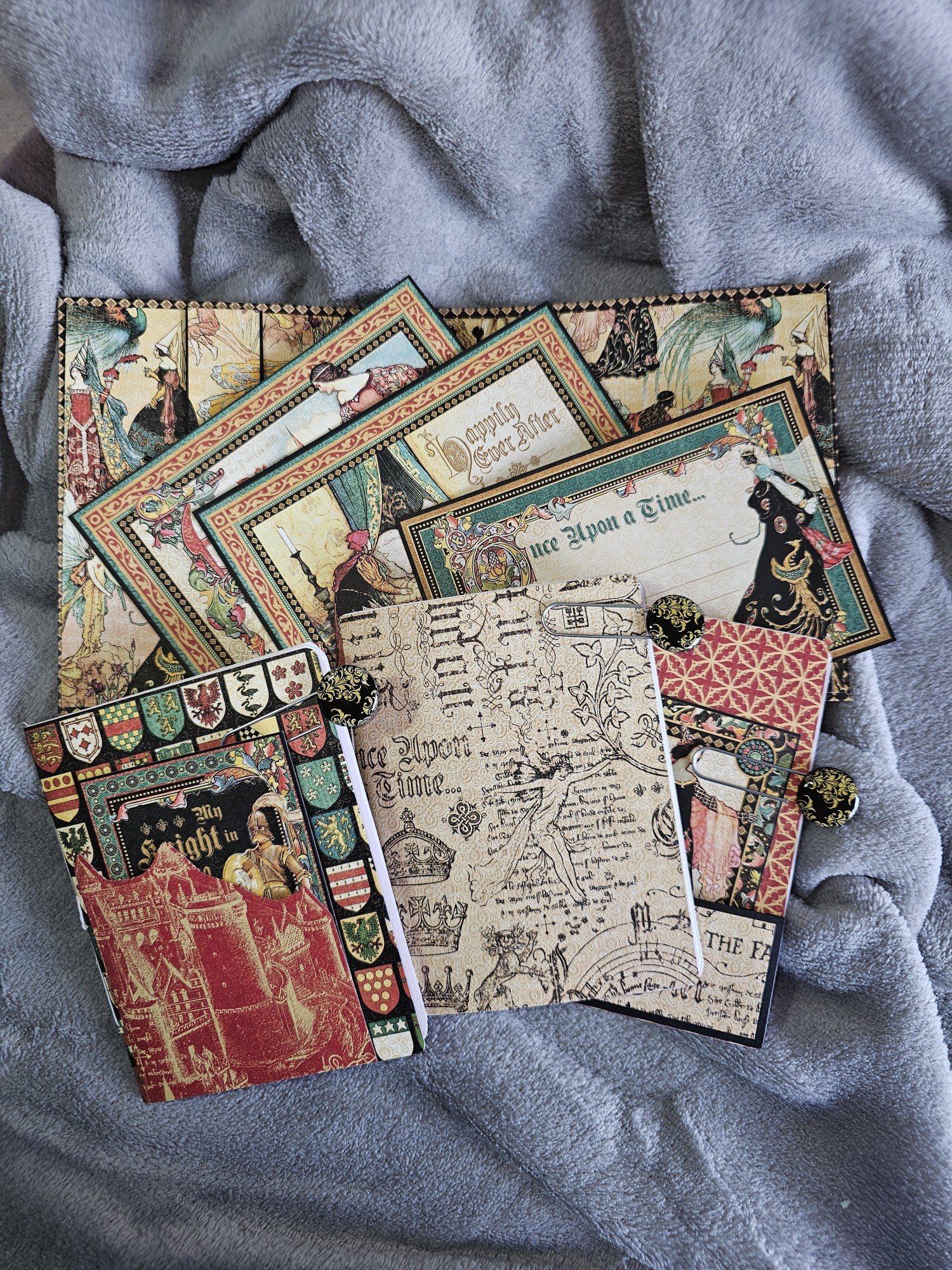 5x6 traveling journal with 3 removable journals that have coordinated journaling cards. Tuck spaces for putting memories in a space space.