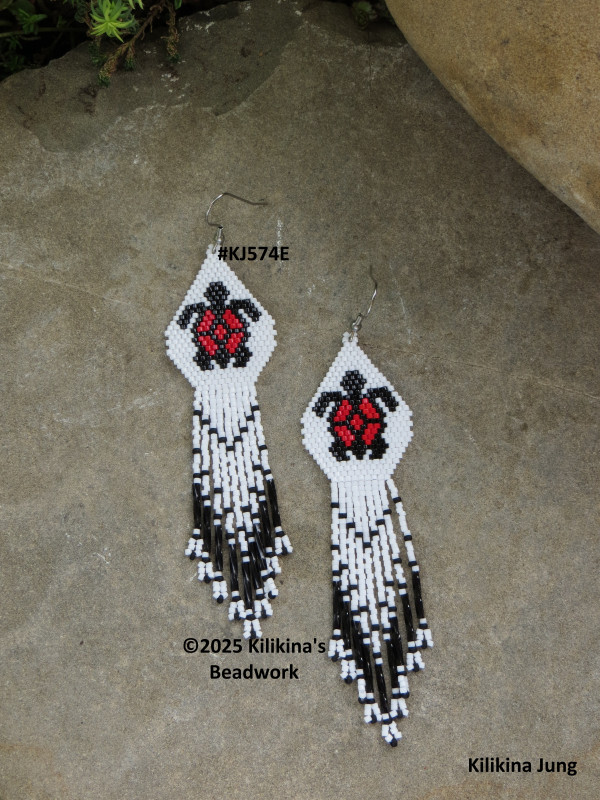 These turtle earrings are made of seed beads - they measure about 1 1/4" wide and about 4" long (not including the hooks). All measurements are approximate. The beadwork is hand sewn. These earrings are on stainless steel fishhooks. (Please note that hook styles may vary due to availability and the jewelry's actual colors may vary depending on several factors, including screens and dye lot variations). ©2025 Kilikina's Beadwork/Kilikina Jung