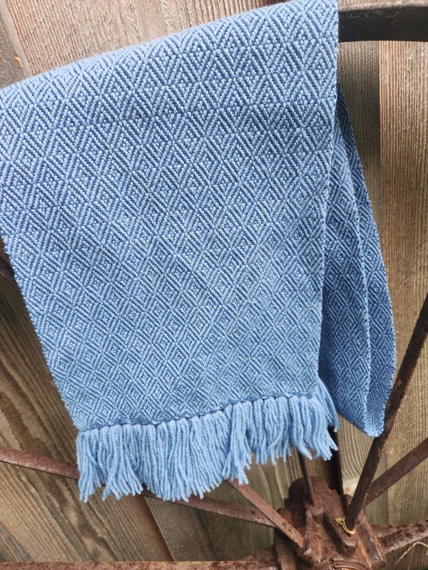 This is a handwoven 100% wool scarf, it is 10" wide and over 66" long with 3.5" hem stitched fringe. Broken Diamond twill weave as the close-up picture shows. Dusty blue warp and a darker blue weft.