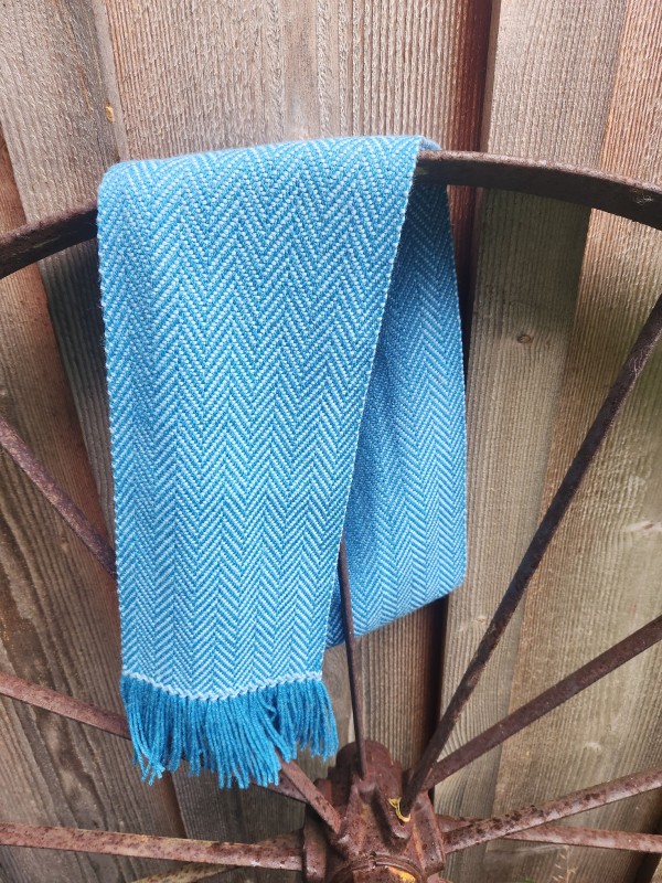 This super buttery soft scarf is handwoven by me, on a traditional floor loom in 50/50 wool/sik warp and weft. Zephyr ocean blue warp and baby blue weft, leaves lovely darker fringe on the ends. Woven in a herringbone twill pattern. Blanket stitch on the fringe makes a nice decorative edging. Slight variations in weave may be seen, due to being handwoven vs machine woven perfection.