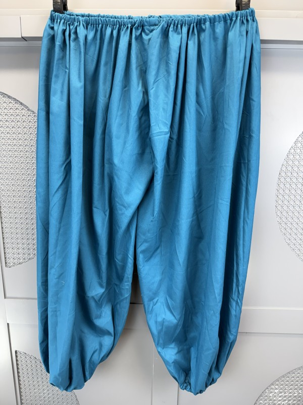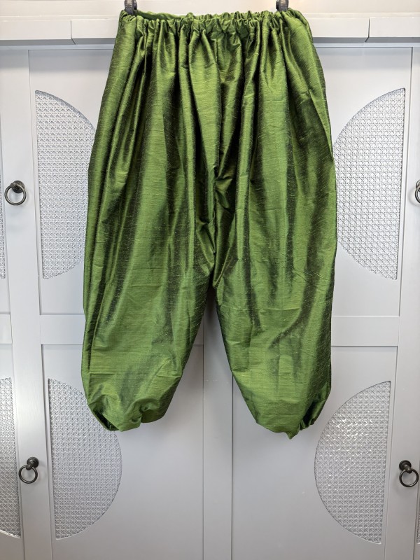 A pair of ridiculously comfortable pants in your size! These pants are flowy and large, with elastic waist and ankles. Fabric options include cotton, silk, or lightweight linens and any colors or patterns available in these styles from PureSilks or Fabric Wholesale Direct.