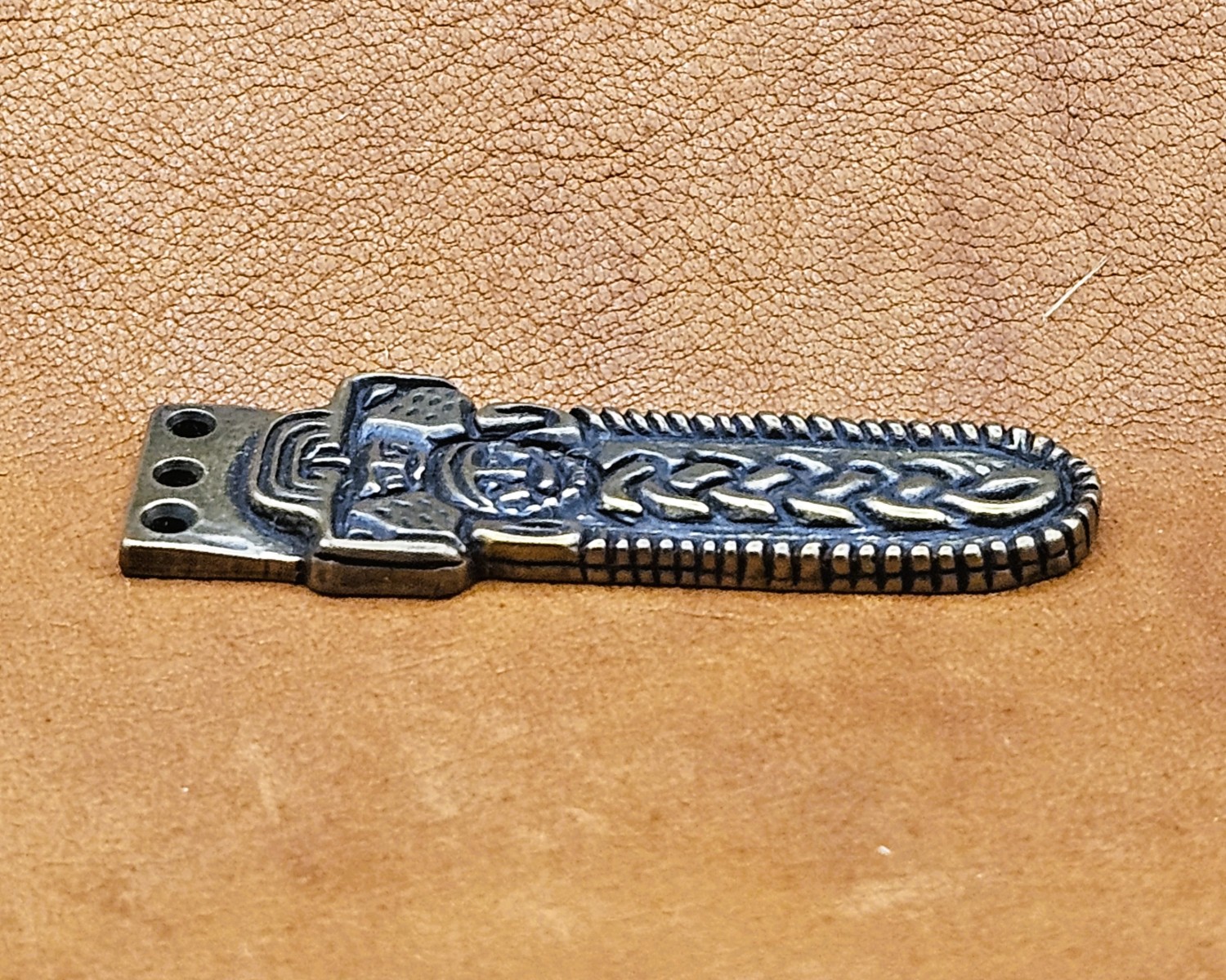 Description: Viking Age belt/strap end with man's face & knotwork drilled with three holes for attaching to a belt or strap end via rivets (not included) or stitching