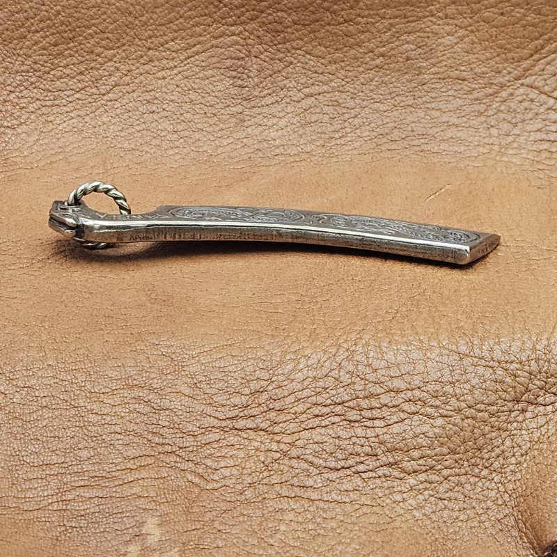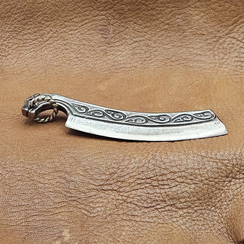 Viking Age bronze ceremonial blade or possibly a animal hoof scraper/groomer. Historical pieces were forged from steel. There is no consensus as to their use. The artwork on our piece is based on Viking Age styles and original to this piece. Warning: the blade is SHARP!