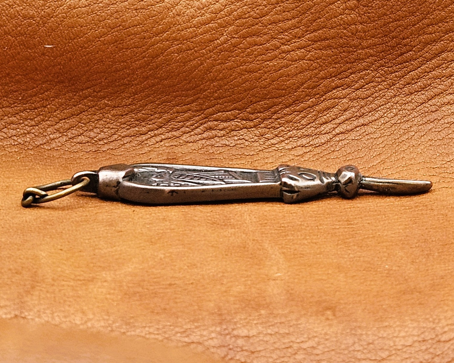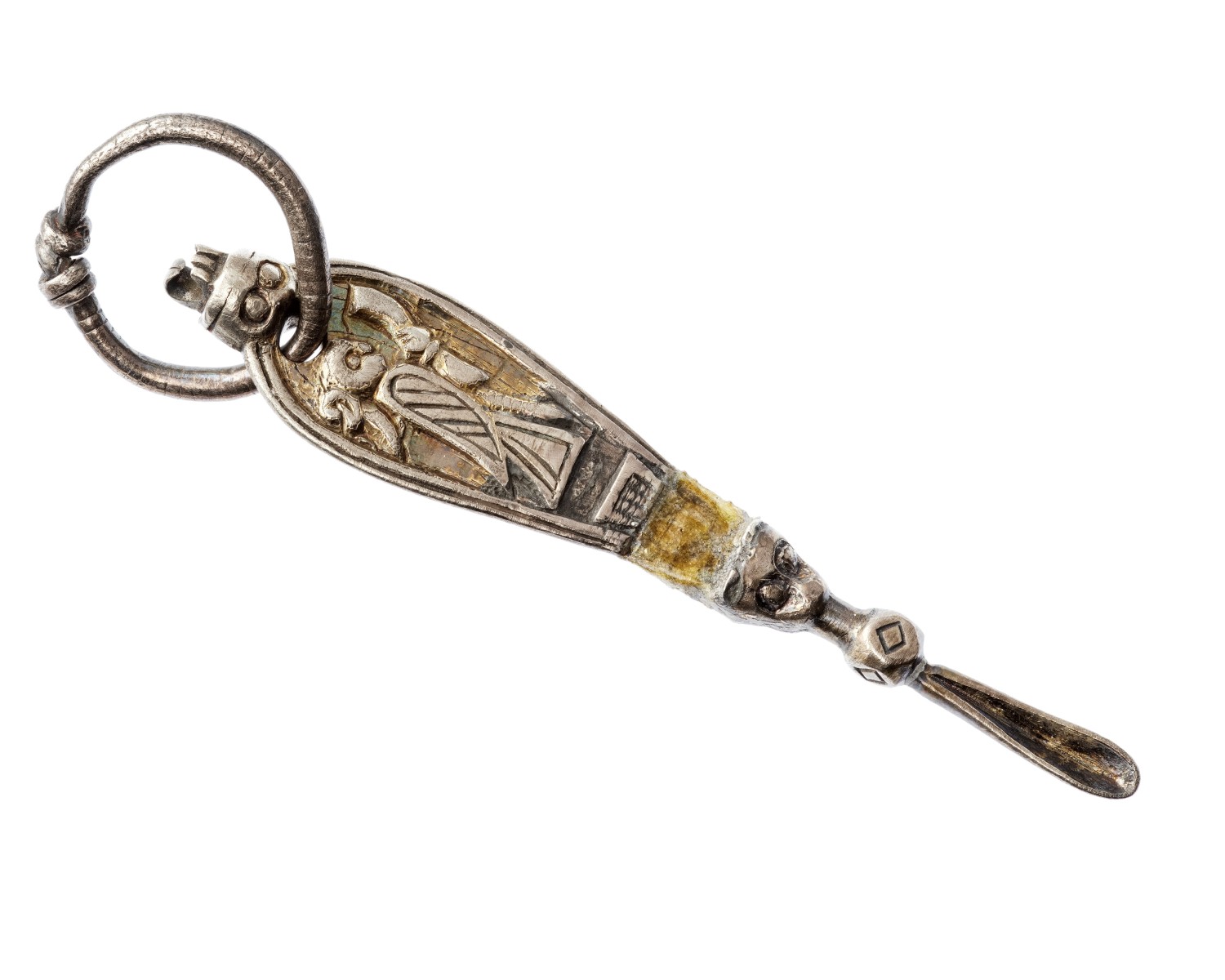 Description: Viking Age earspoon from Birka, Adelso parish, Uppland, Sweden. Cast in either bronze or silver depicting a female on one side and a canid on the other (Valkyrie and Fenrir?).