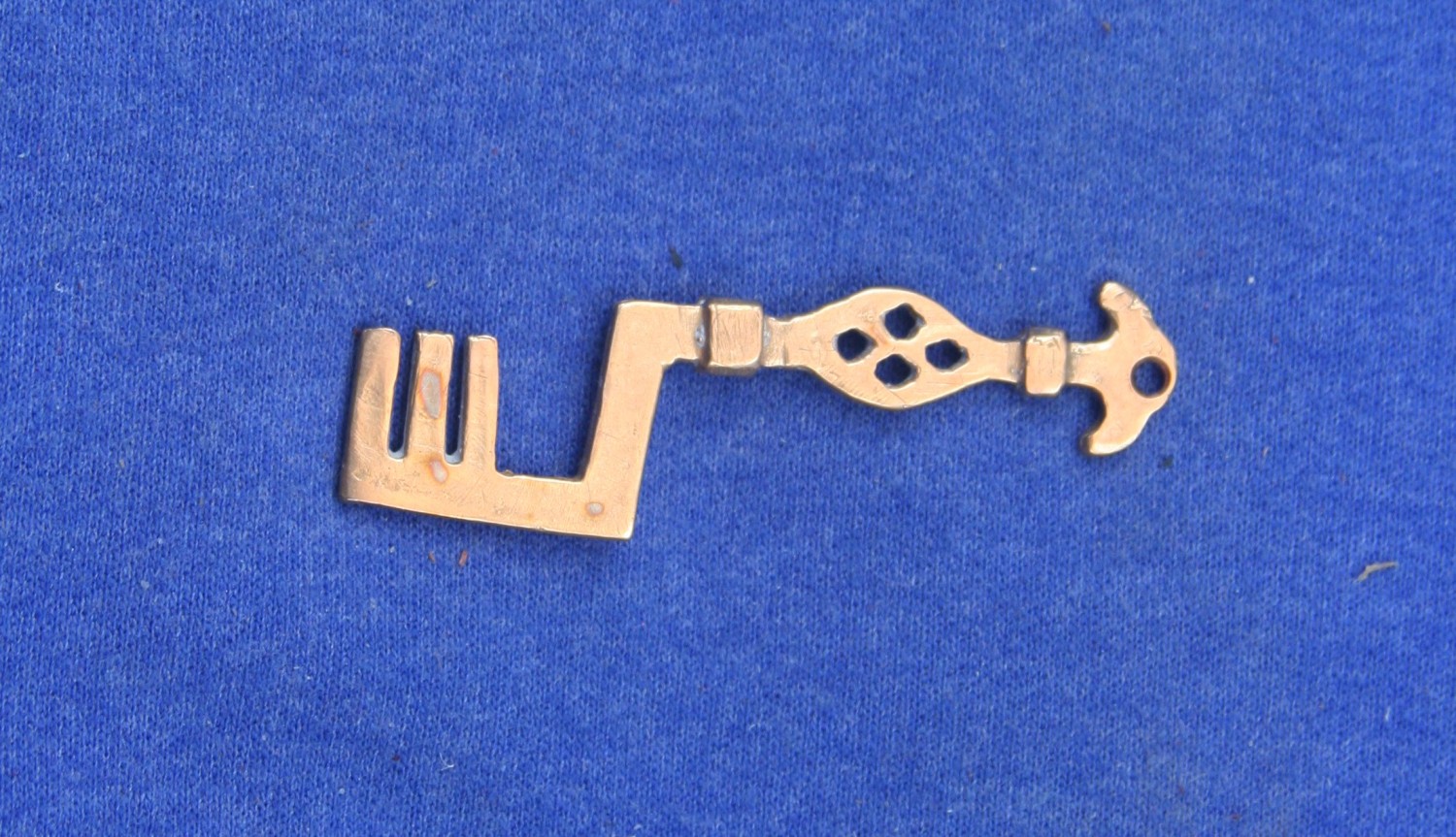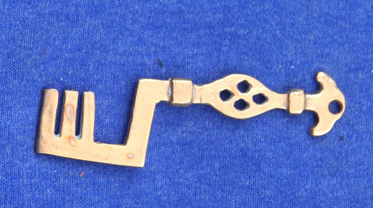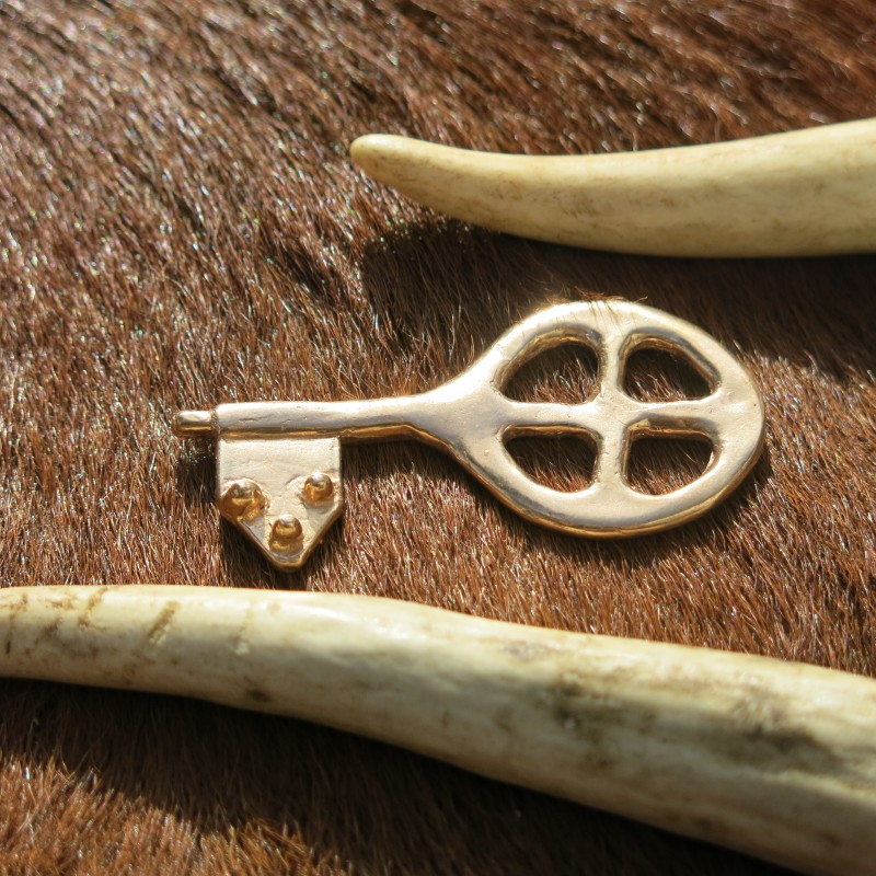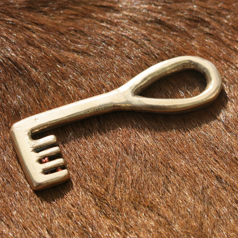 Exact Copies, within 1mm, of Viking Age keys in the Swedish National Museum. The original circular handle key with griping beasts is in the National Museum of Denmark. All keys are cast using the same formula of bronze as the original. The points on the key releasing the lock mechanisms when the key is turned is a newer type of lock than the earlier sliding key locks.