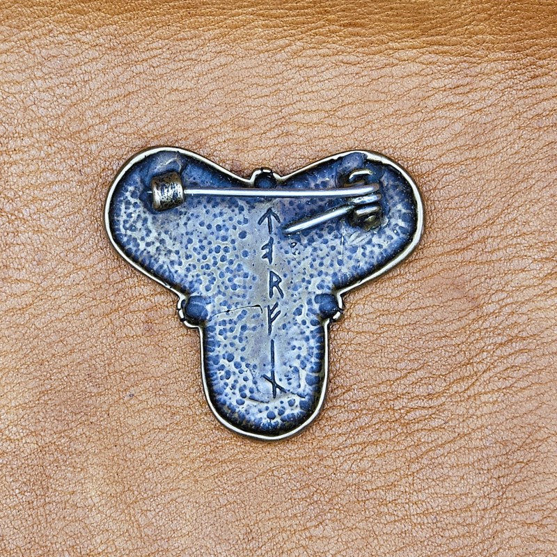 Description: Viking Age trefoil brooch from Smaland, Sweden, dated to the 9th century, with heavy-duty stainless steel pin. The original was part of a Frankish baldric.
