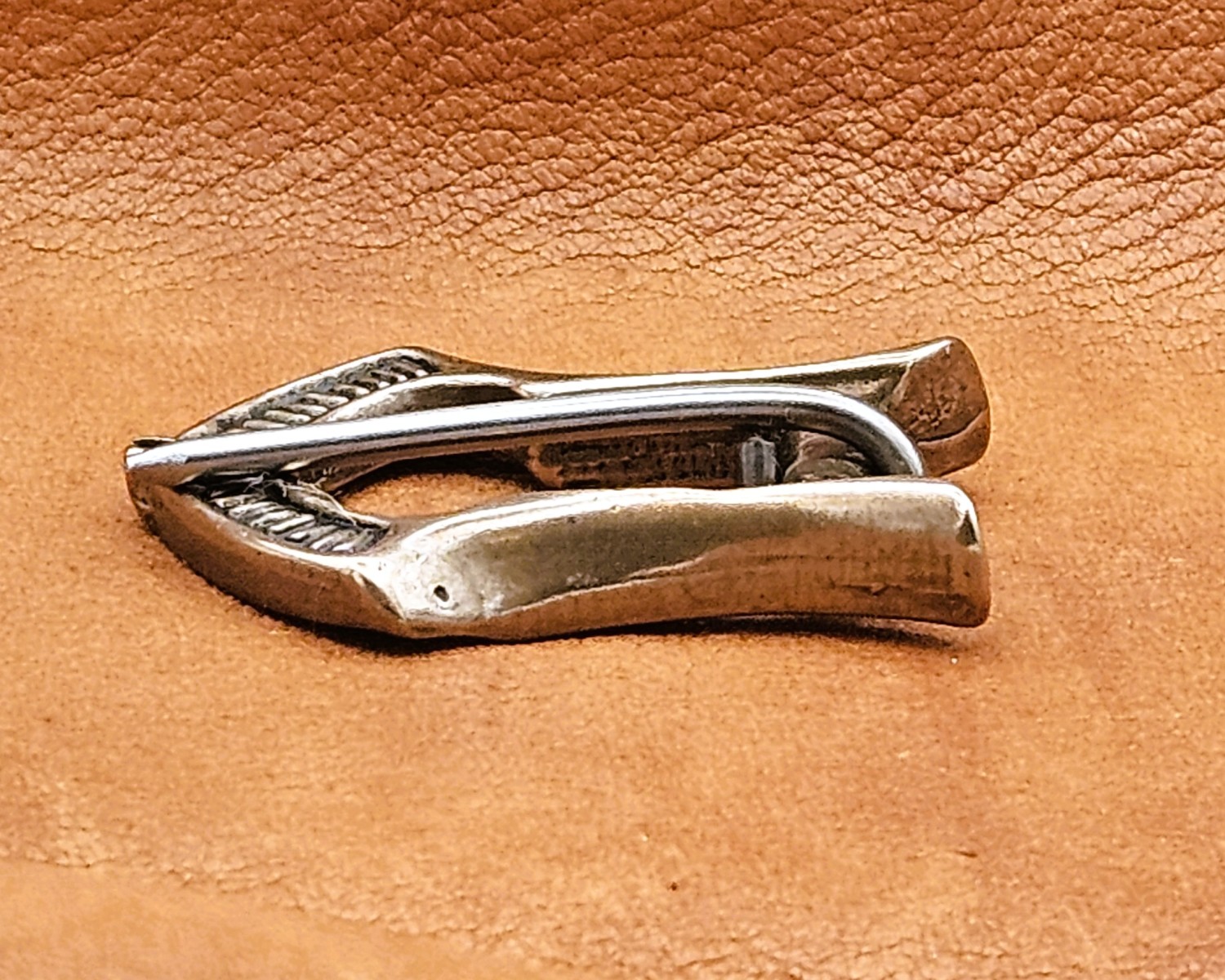 Description: Viking Age buckle for use with belts or armor in bronze with stainless steel prong. Original from Norrbotten, Sweden from a Saami votive deposit.