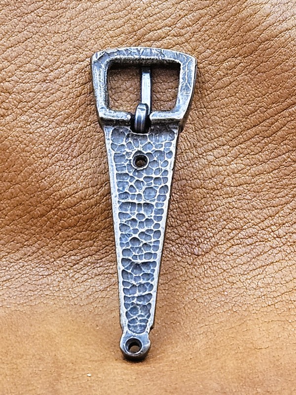 Description: Viking Age buckle (v2) with a stainless steel prong. Drilled in two places to allow for rivets (not included) or sewing to belt blank or armor.