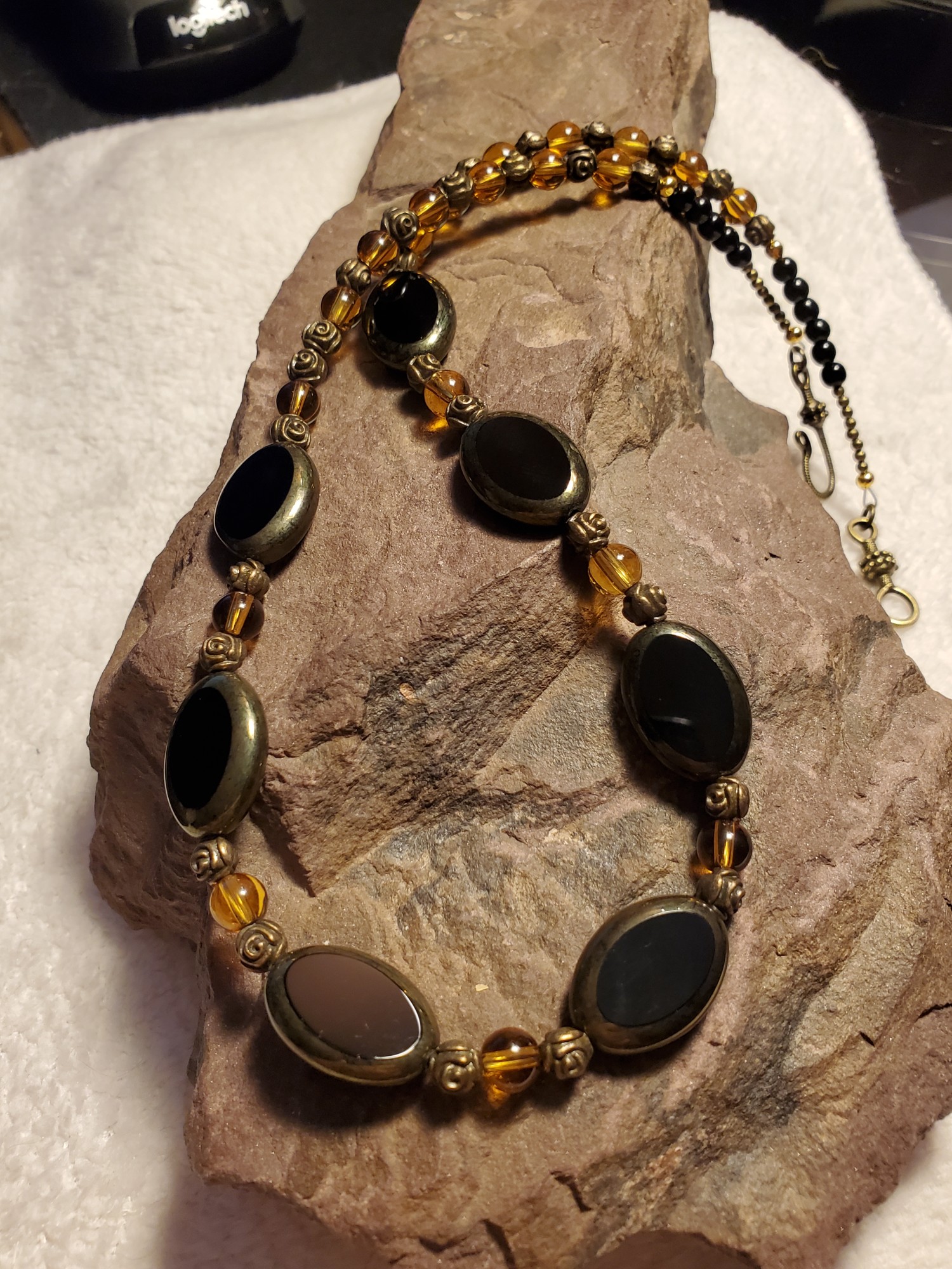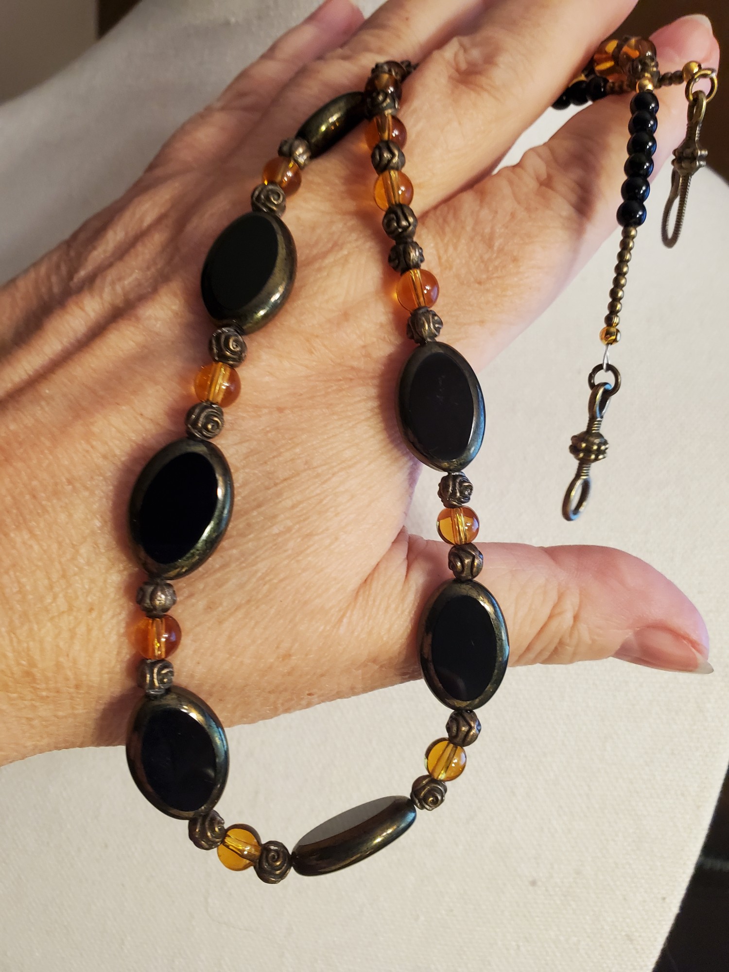 Antique German Gold plated Black Glass, Amber in Bronze,