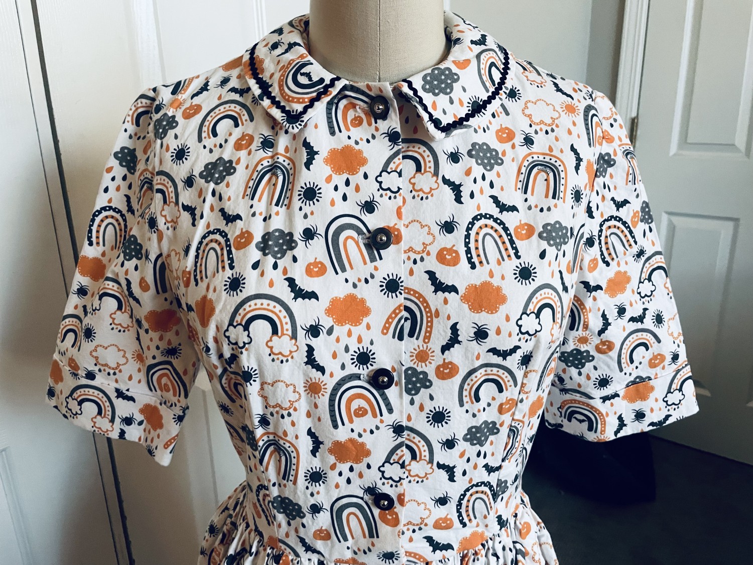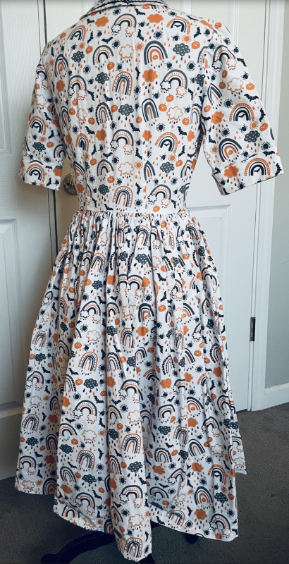 This is a vintage style Halloween themed dress. I used Simplicity 4940, a 1963 original pattern. Dress has a fitted bodice with a high neckline and front button closing. The skirt is full and gathered at the waistline. I have added two pockets.