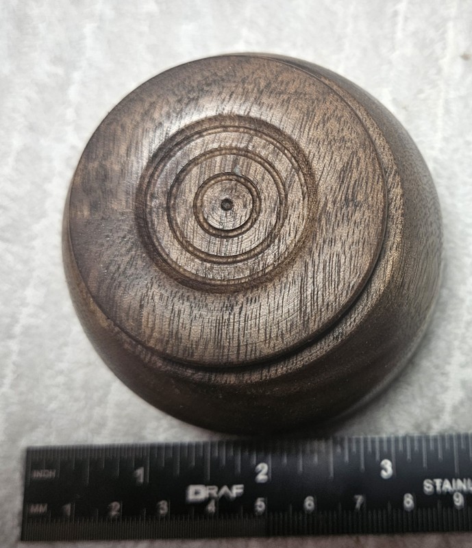 Footed Walnut bowl with an attractive grain pattern. The small foot gives the illusion that the bowl is floating above the shelf.