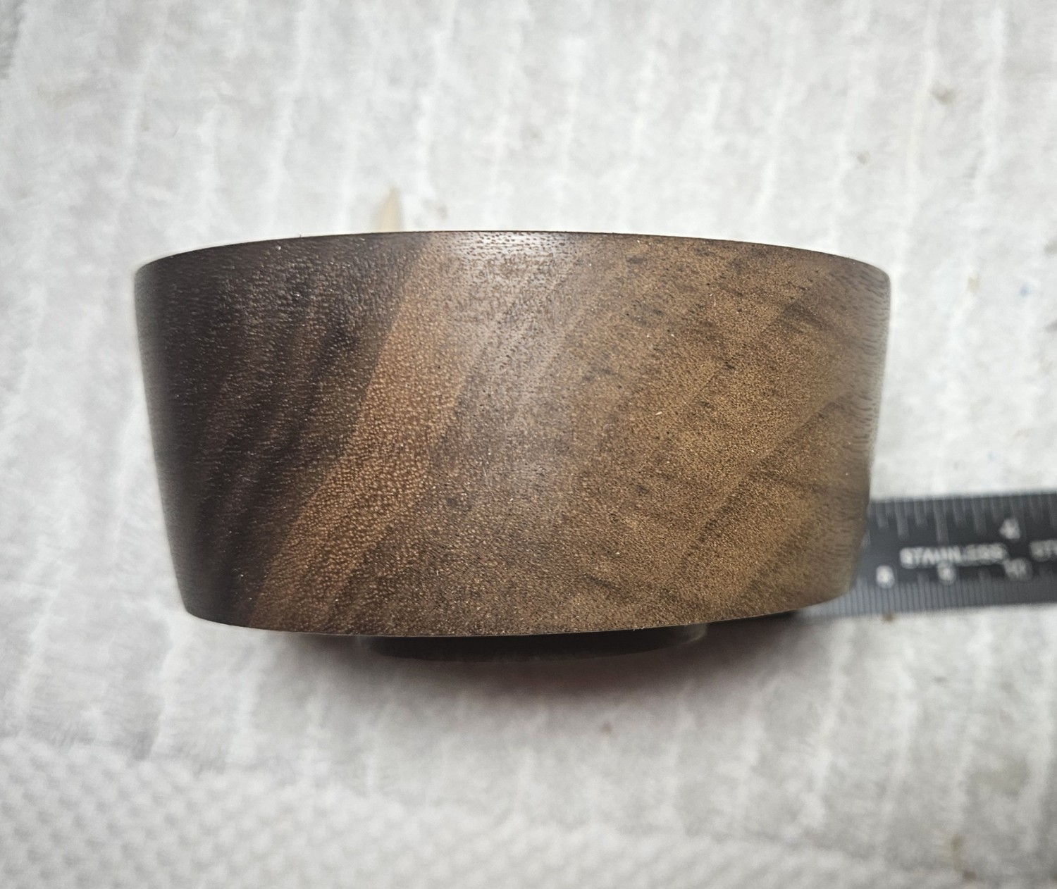 Footed Walnut bowl with an attractive mix of heart ans sap wood.. The small foot gives the illusion that the bowl is floating above the shelf.