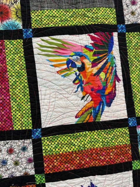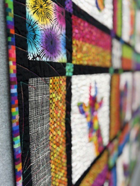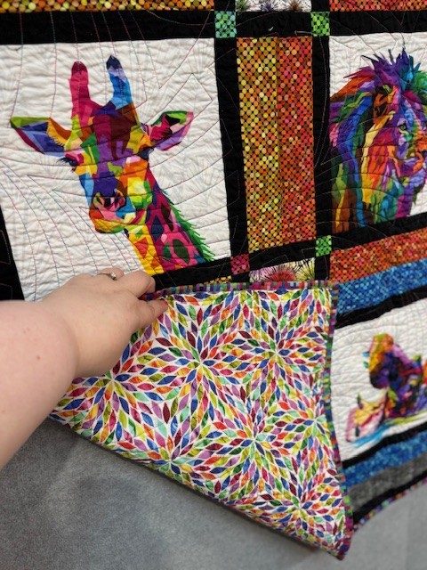 Each animal block is framed with brightly pattered fabrics and bordered in black for a striking stained-glass effect. The combination of bold color and fine quilting makes this piece both playful and sophisticated, perfect as a baby quilt, lap quilt, or statement décor piece.