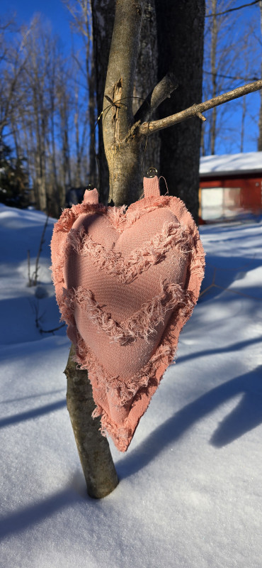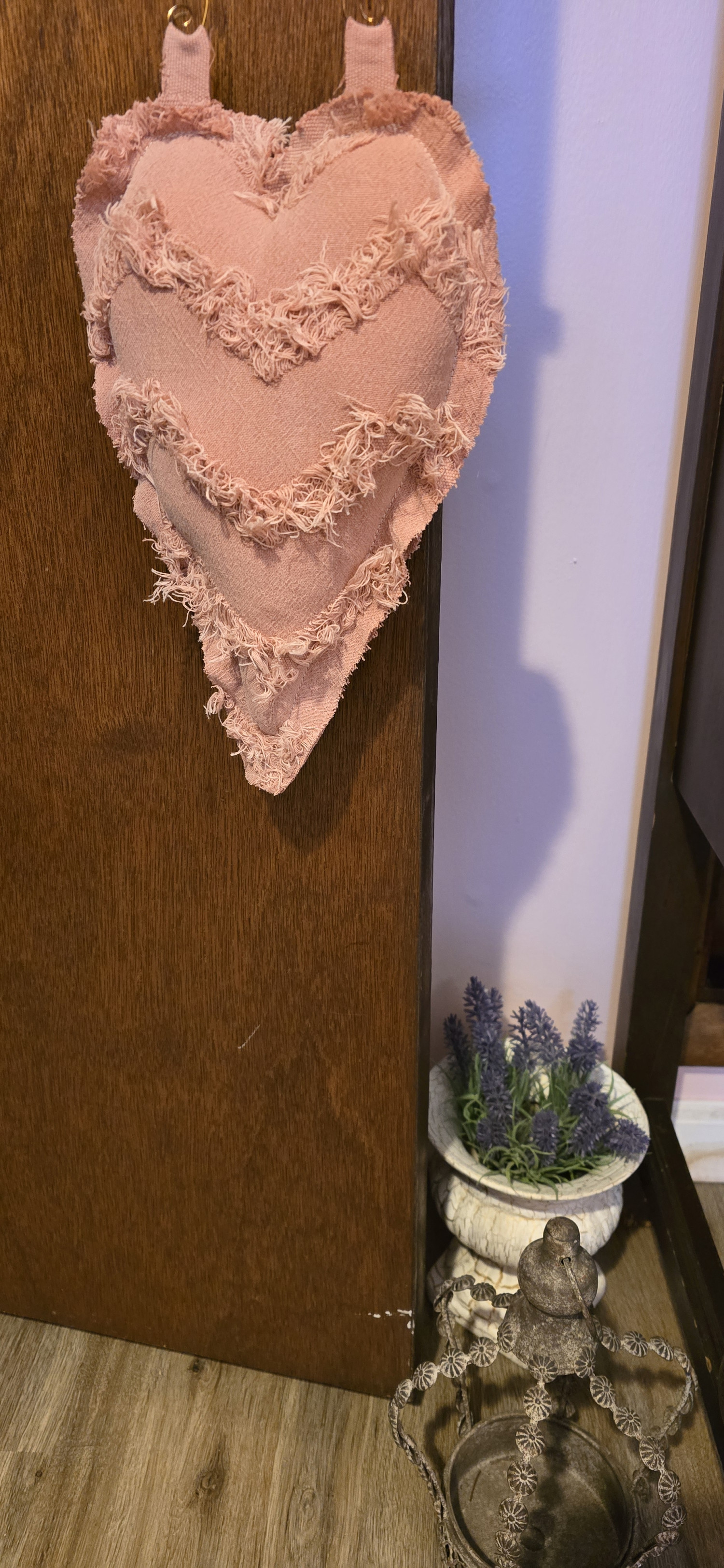 Pink fabric, with shaggy detailing, Hanging on brass colored wire