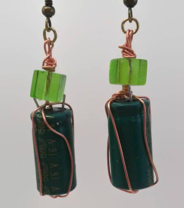 Wire wrapped capacitors from a computer motherboard accented with green glass beads. PDD042