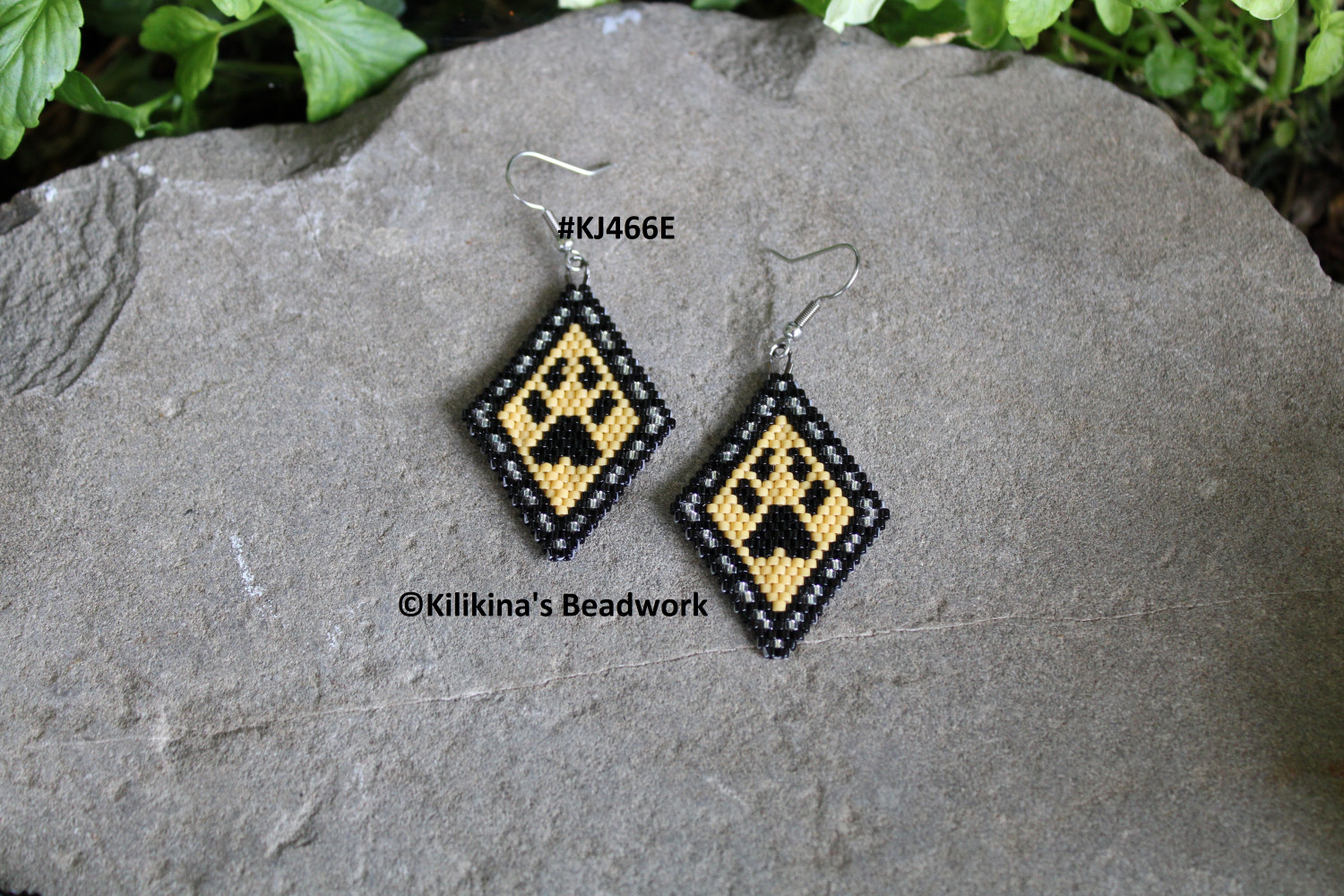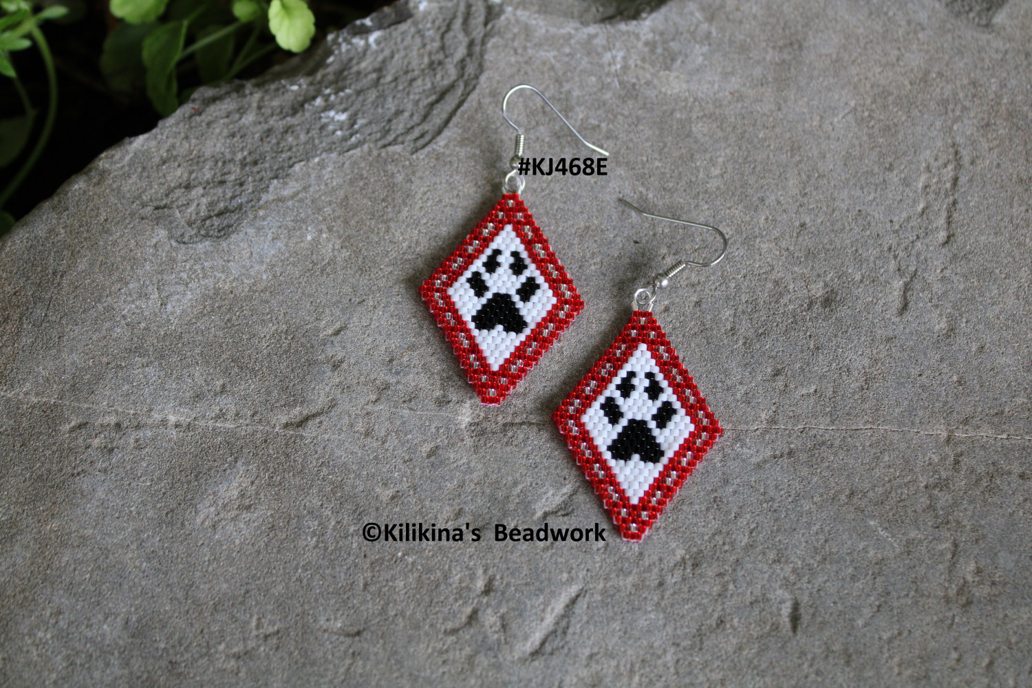 These Wolf Paw Print earrings are made by Kilikina using Delica seed beads, making them very light weight and easy to wear. They measure about 1 1/4" wide and about 1 3/4" long (not including the hooks). All measurements are estimated. The beadwork is hand sewn. These earrings are currently on stainless steel fishhooks. The fishhooks can be changed to posts or clips if requested. Buyer must request the change by message, before or when the item is purchased, as for I need to make any changes before packing and/or shipment.