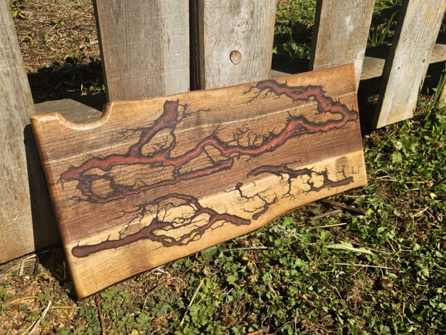 Bespoke wood and resin charcuterie boards, made one at a time to burn a unique lightning pattern into the surface. Each pattern is then filled with a food safe Resin, colored to create the gorgeous swirls and currents. Sanded and finished with a food grade finish to create a matte surface, and ready to use