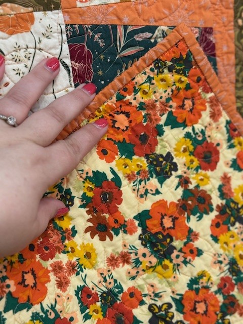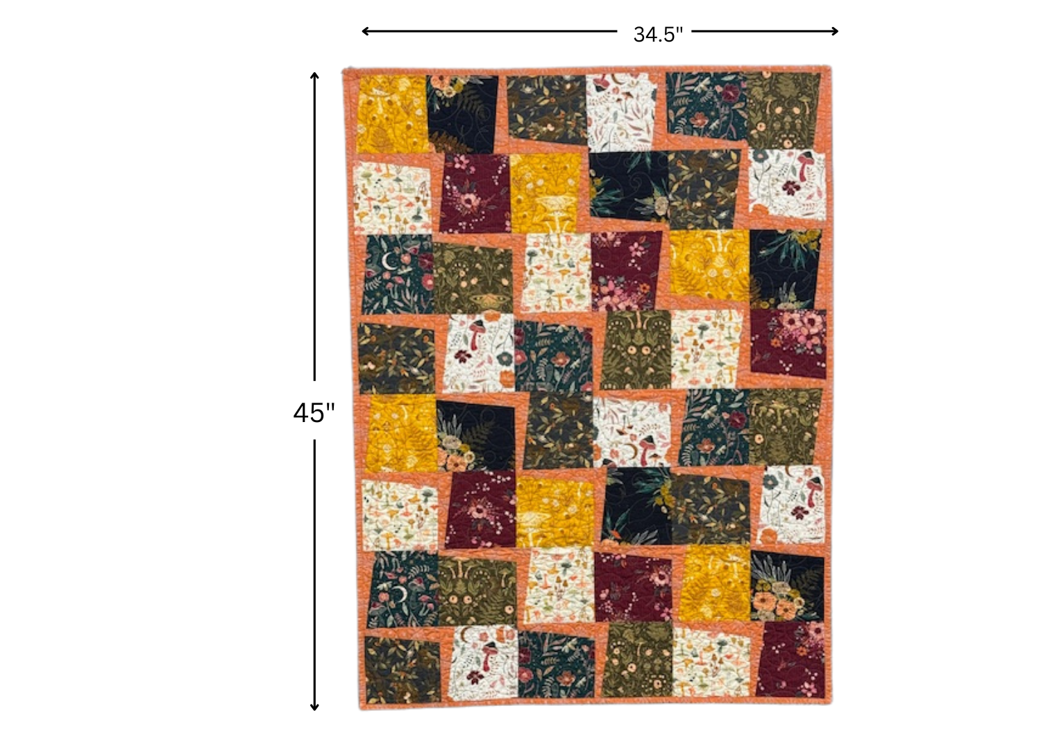 Framed in a warm rust-orange lightning bolt sashing, this smaller throw-size quilt (34.5" x 45") makes a charming accent for your couch, reading chair, or wall. Its nature-inspired palette and intricate prints evoke crisp fall mornings, forest walks, and the simple joy of handmade craft.