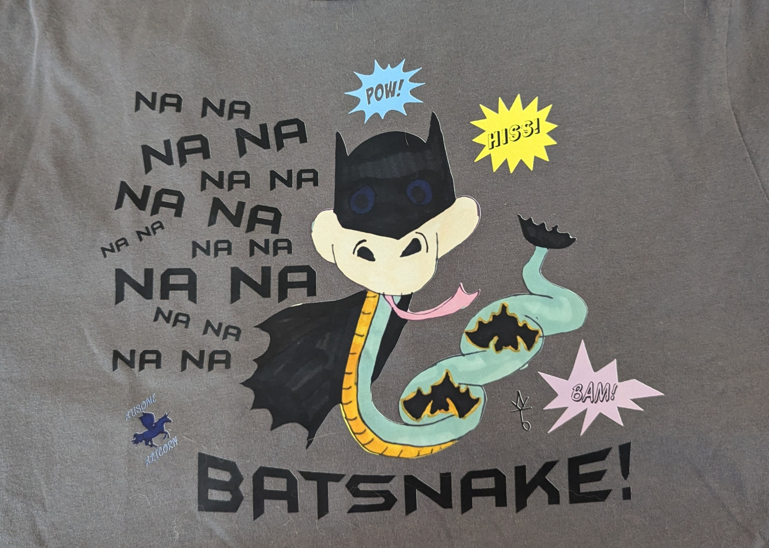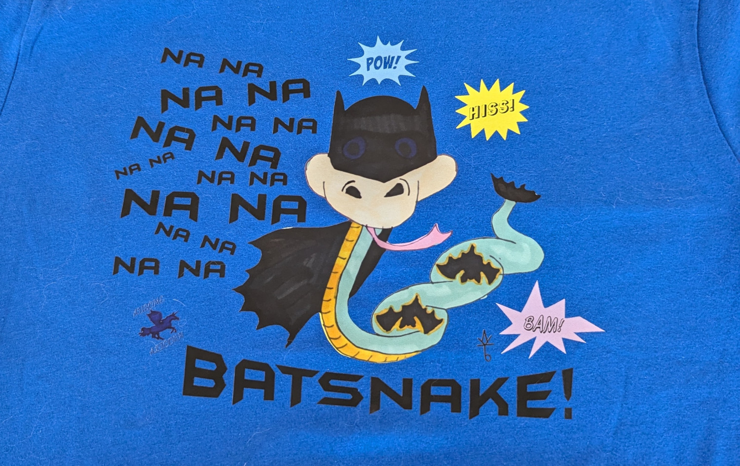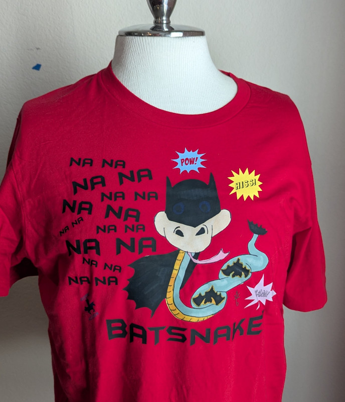 This exclusive design features my original art showing a snake dressed as a popular superhero. It is sure to be a hit with fans of superheroes, snakes, and/or unique designs! Our logo is featured on the back of the shirt. We currently design and heat press our shirts in our home studio using a DTF transfer of my original designs. Since the shirts are pressed by me or my family, they may have minor imperfections. We are getting better with each shirt we make!