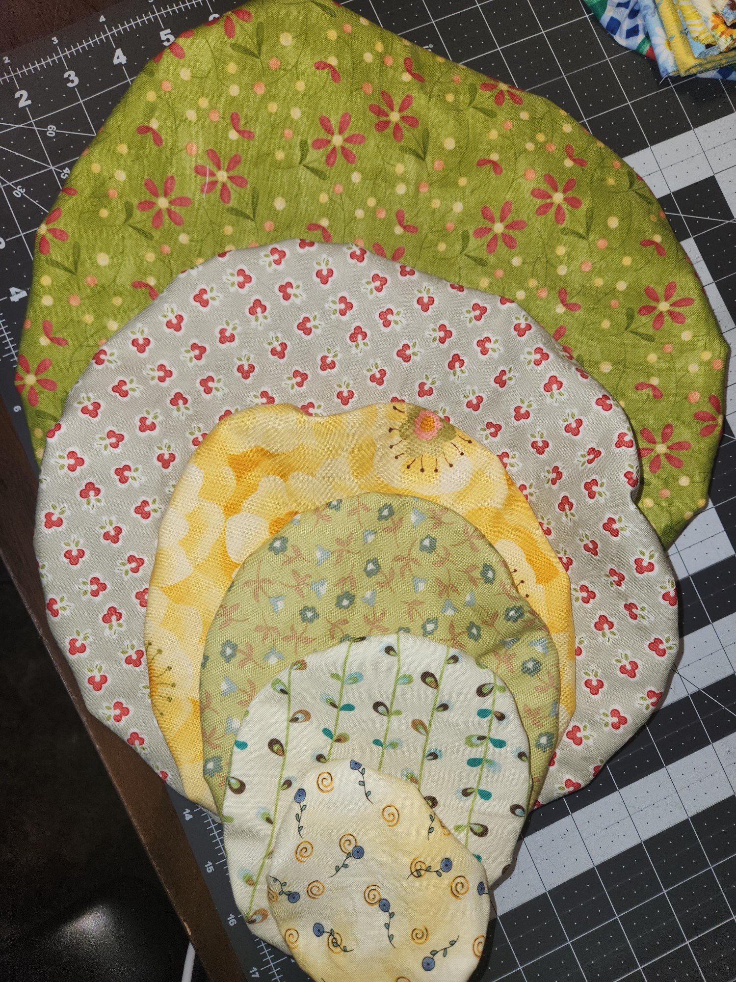 Set of six bowl bonnets. Size range from xs bowl to XXL bowl. Made from 100% cotton. Very versatile in use. Can be dampened if what you are covering needs a little extra humidity. Toss into the laundry as needed. Fabric is prewashed to prevent shrinkage and color running. Single bowl bonnets available for $3 each.