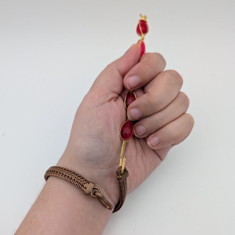 If you have difficulty putting on bracelets, try using a bracelet hook helper. While holding the helper in the hand that you are going to put a bracelet on, hook the bracelet loop onto the helper hook then bring your clasp around to close the bracelet.
