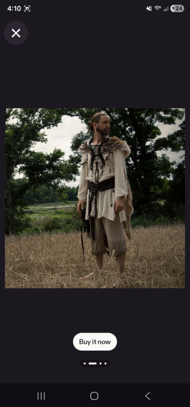 This cloak is made to order from two full Covote pelts, and is designed to tie over the chest, with secondary ties under the arms to keep it in place. As no two Coyotes are exactly alike, cloaks may differ slightly from those pictured. Our impala horn necklace pictured with the cloak is also available