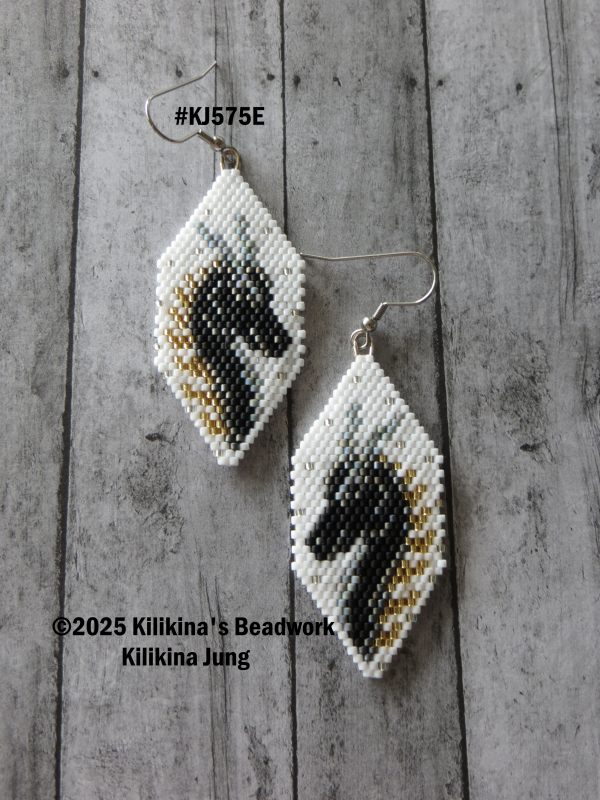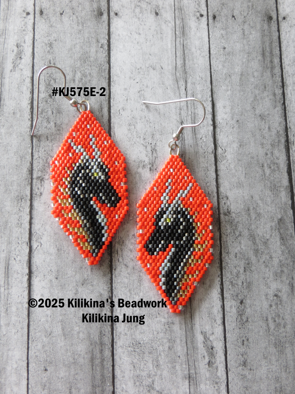 These beautiful Dragon earrings are made of seed beads - they measure about 1" wide and about 2 1/2" long (not including the hooks). All measurements are approximate. The beadwork is hand sewn. These earrings are on stainless steel fishhooks. (Please note that hook styles may vary due to availability. The earrings actual colors may vary depending on several factors, including screens and dye lot variations). Original Pattern Credit: PenguBeading. ©2025 Kilikina's Beadwork, Kilikina Jung.