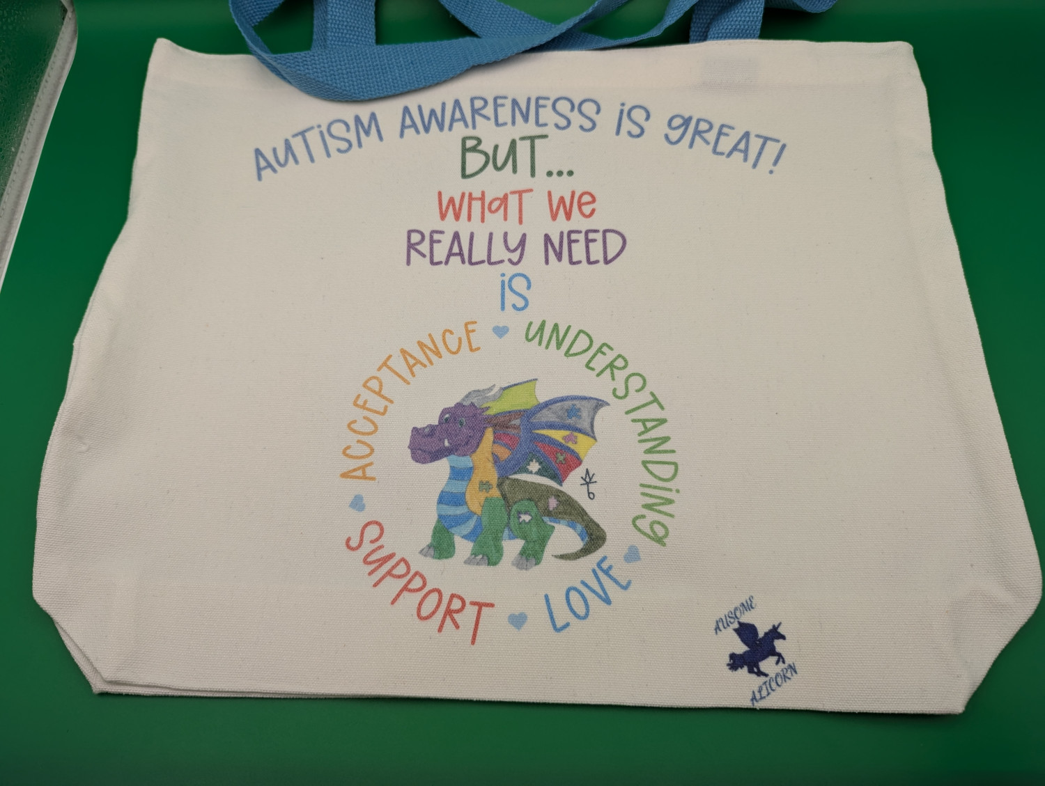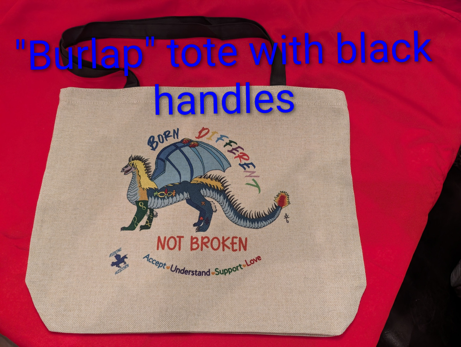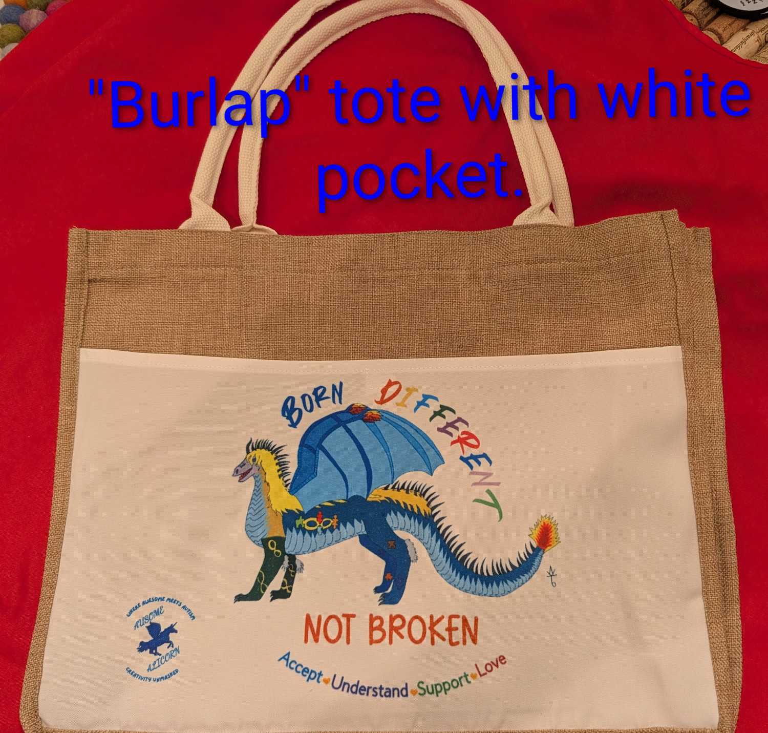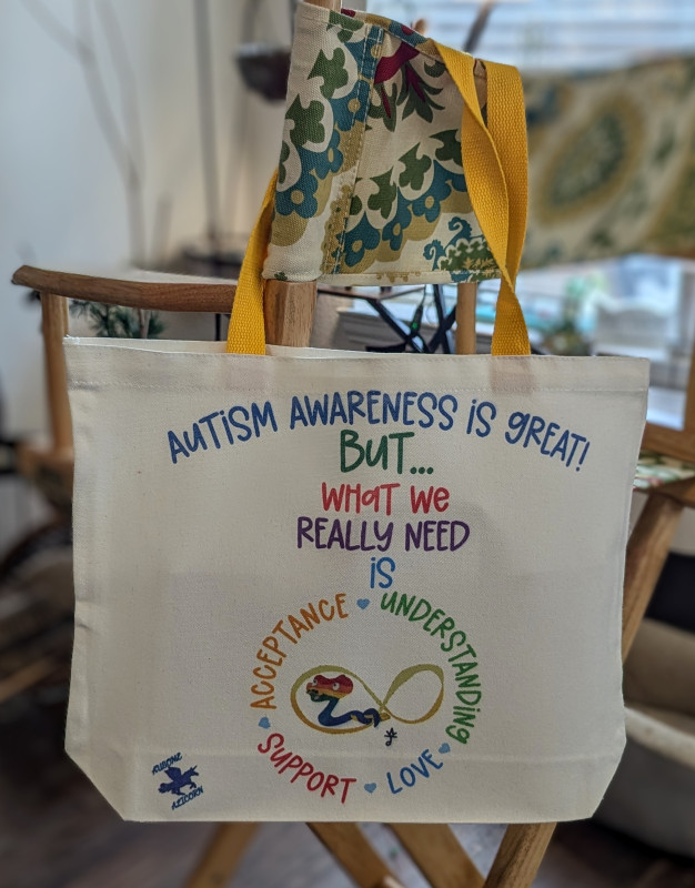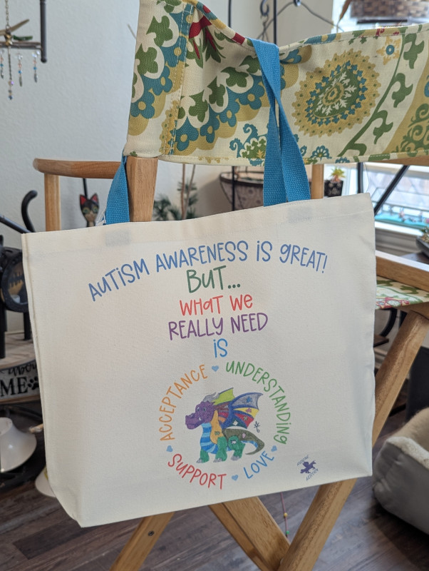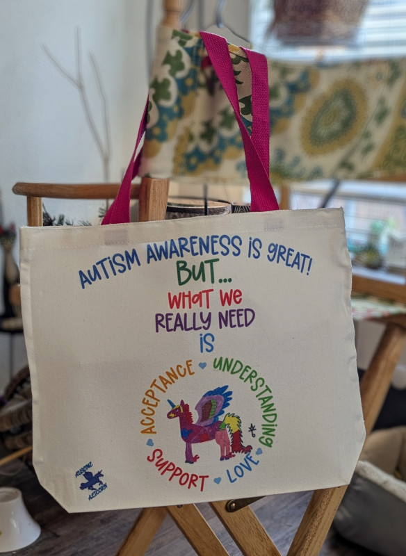 These tote bags use our exclusive Autism Acceptance designs featuring my original art. The design may be on one or both sides depending on the tote bag. We have several designs available. Be sure to browse our shop for other items featuring these designs.