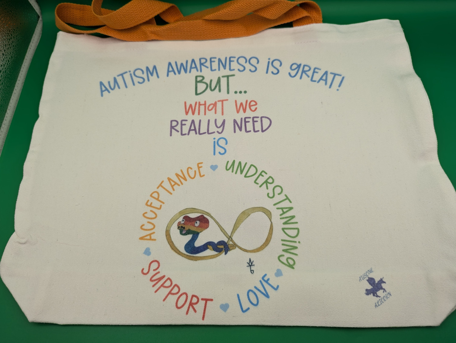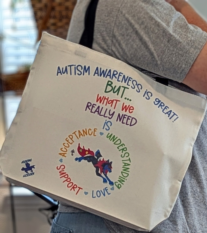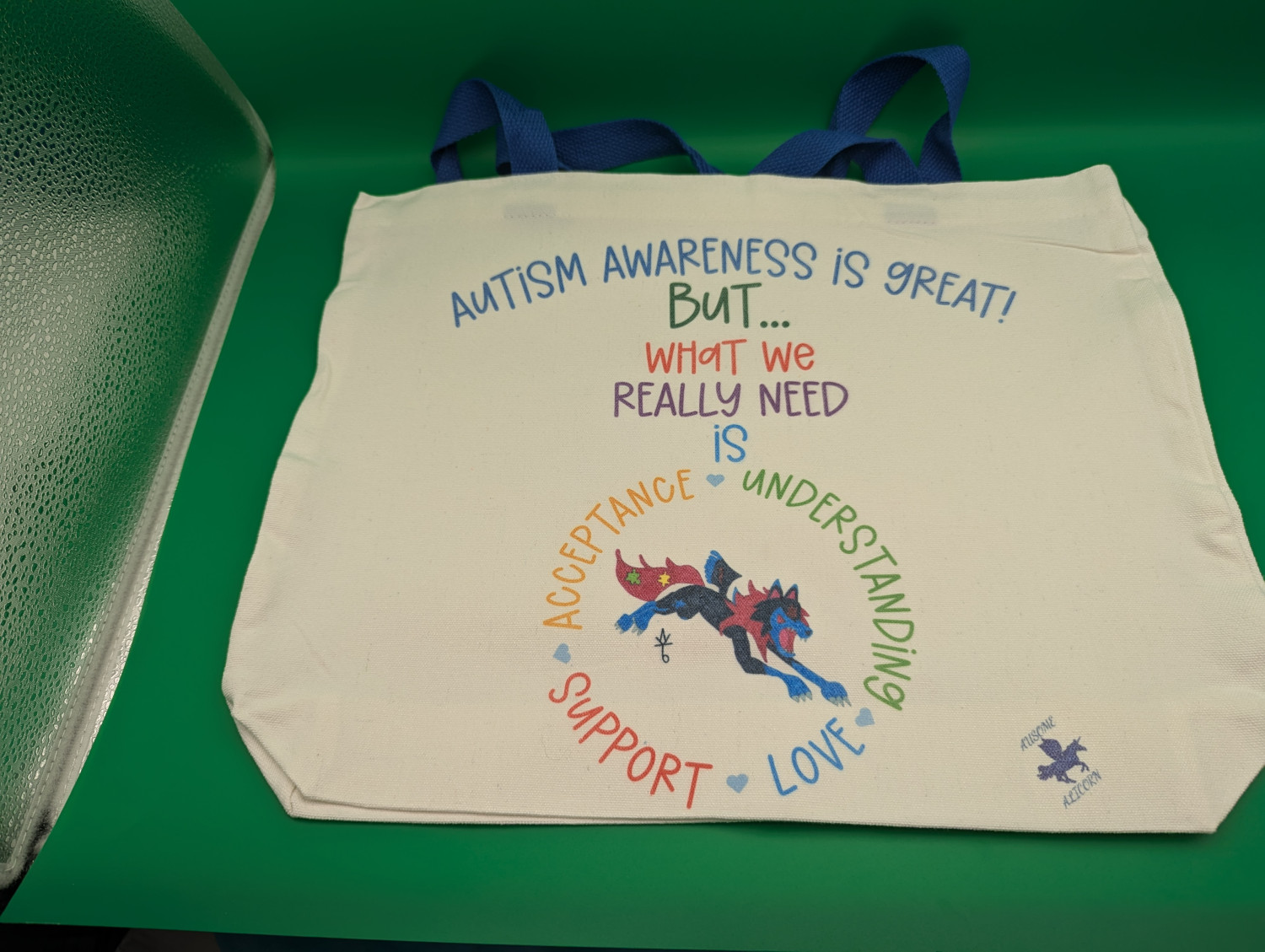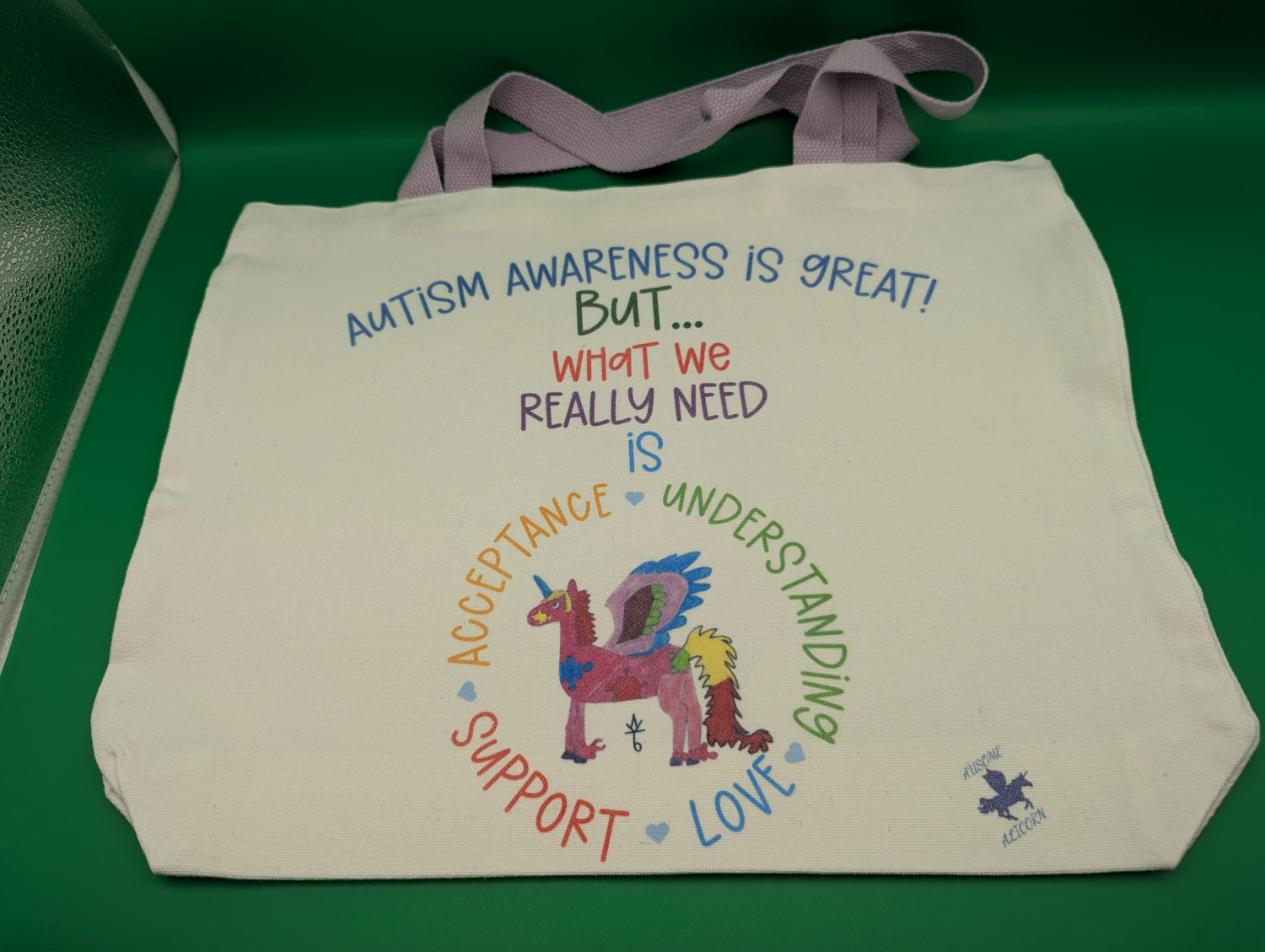 These tote bags use our exclusive Autism Acceptance designs featuring my original art. The design may be on one or both sides depending on the tote bag. We have several designs available. Be sure to browse our shop for other items featuring these designs.