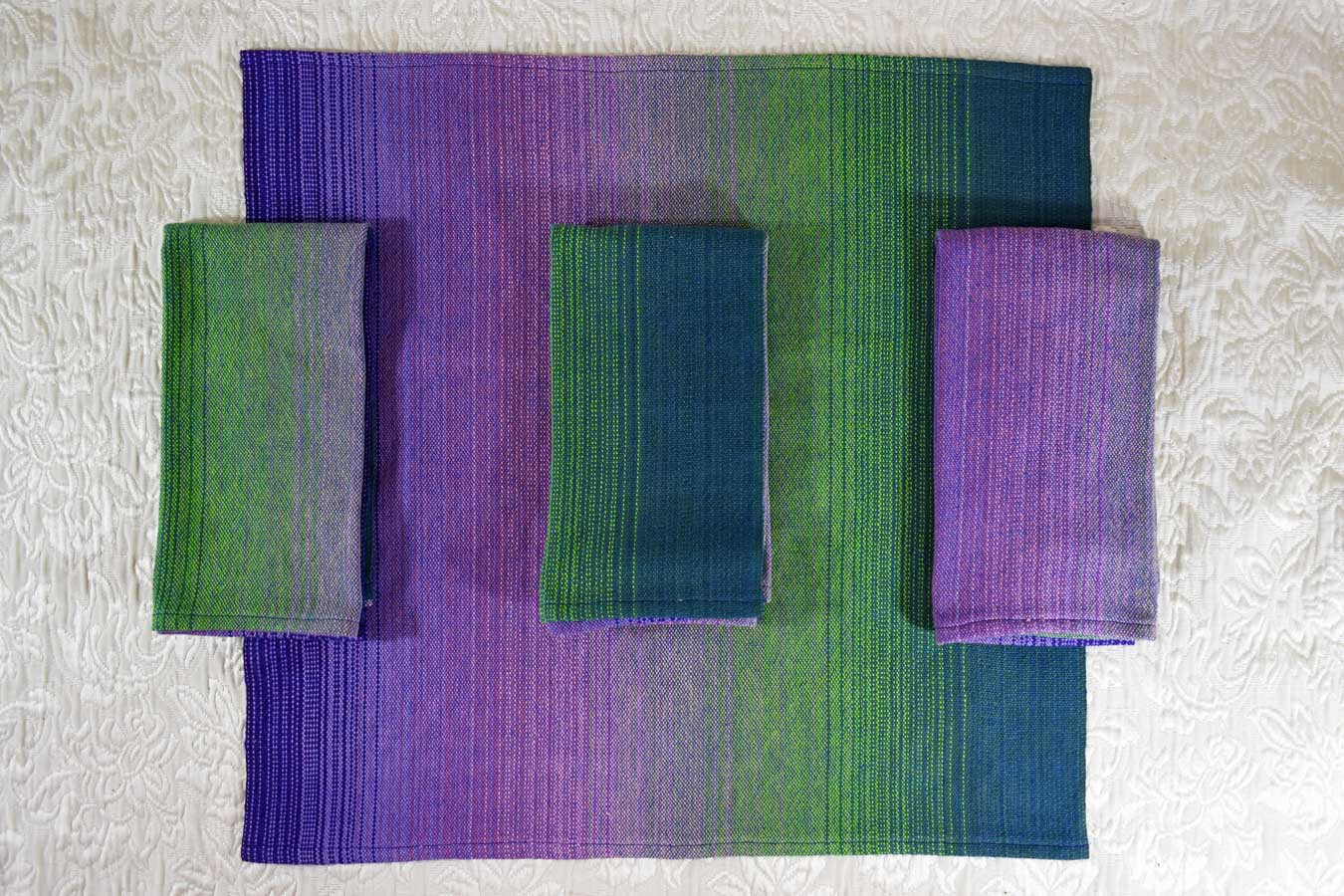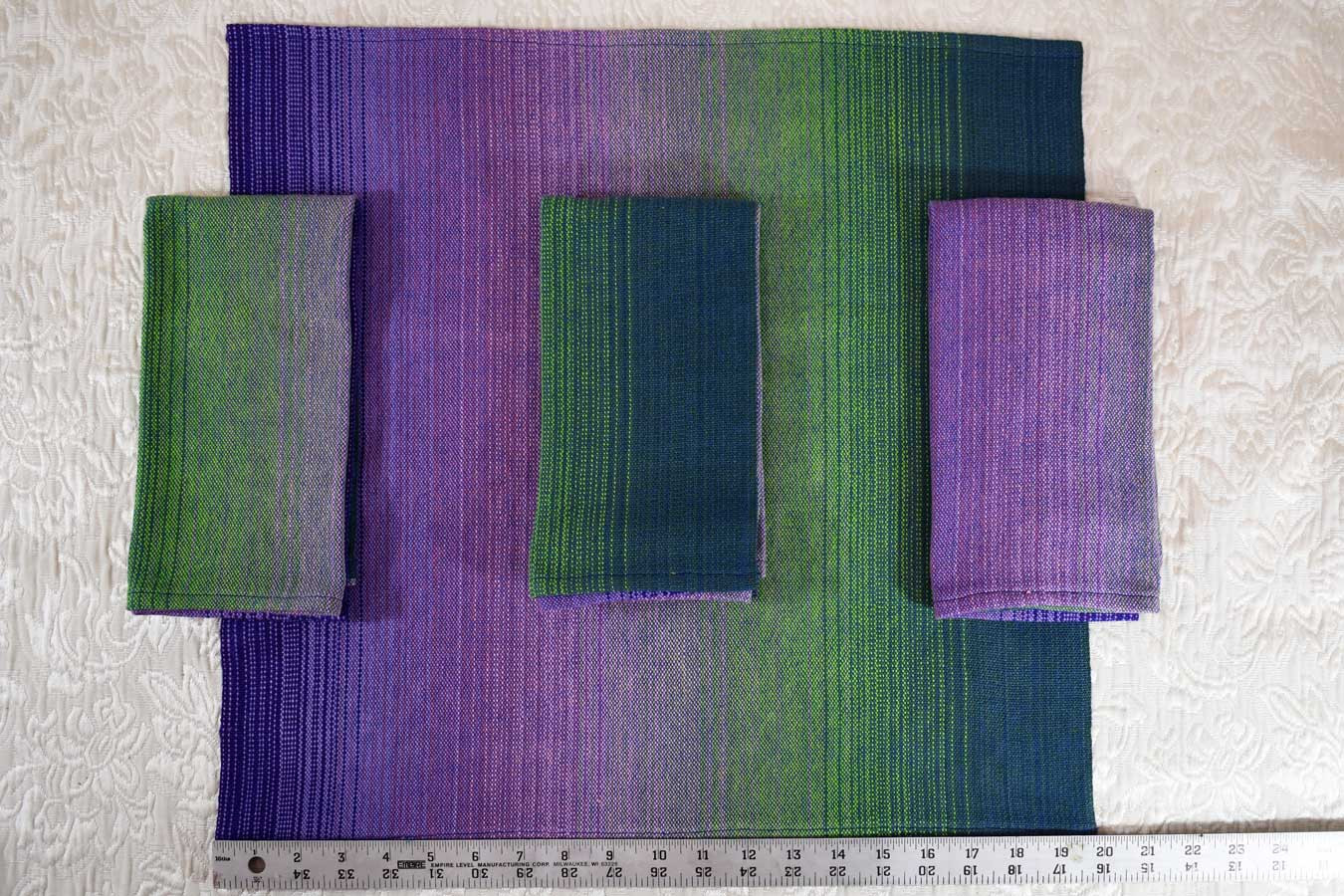Here is a set of 4 handwoven napkins, in a lovely gradient from purple through pink and into green. They are 100% cotton, and can stand up to daily use for years. I've been using my own version of these for ages! You can toss them in the wash on warm, and tumble dry, so taking care of them is a breeze. At just under 20" square, they are a generous size. And since they fade from one color to another, you can switch up the look you get at your table depending on how you fold them.
