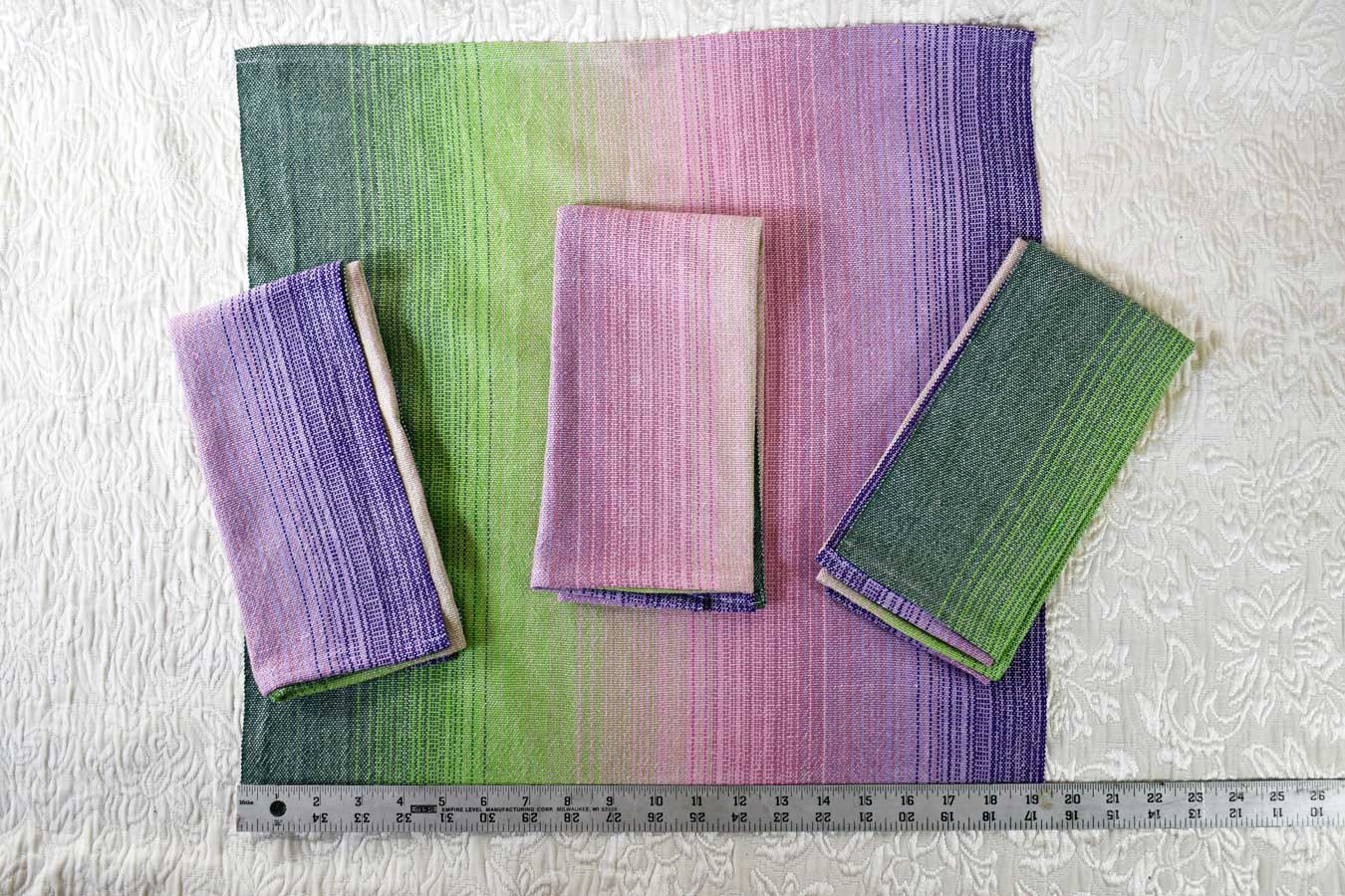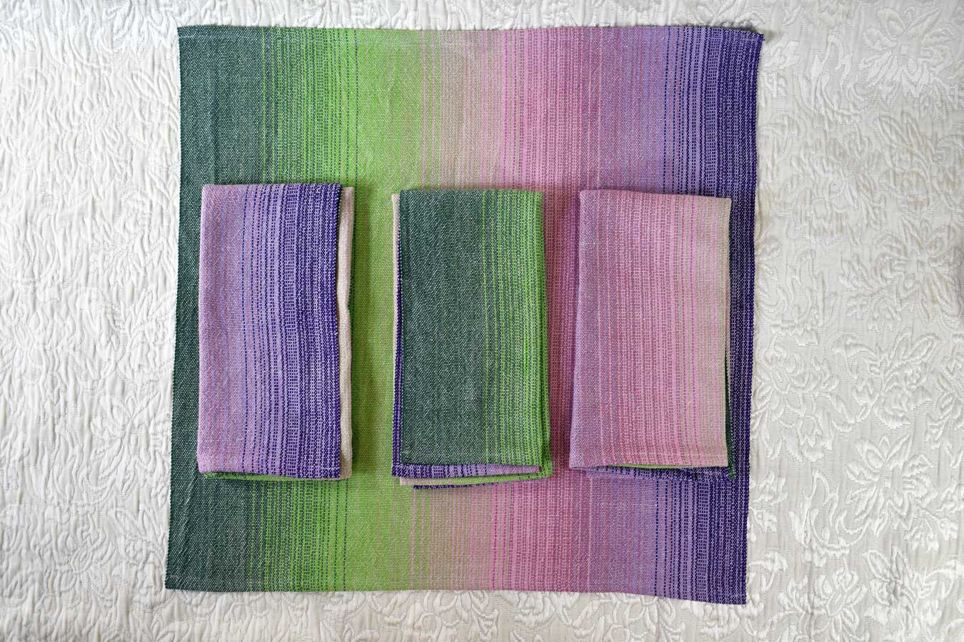 Here is a set of 4 handwoven napkins, in a lovely gradient from purple through pink and into green. They are 100% cotton, and can stand up to daily use for years. I've been using my own version of these for ages! You can toss them in the wash on warm, and tumble dry, so taking care of them is a breeze. At 19" square, they are a generous size. And since they fade from one color to another, you can switch up the look you get at your table depending on how you fold them.