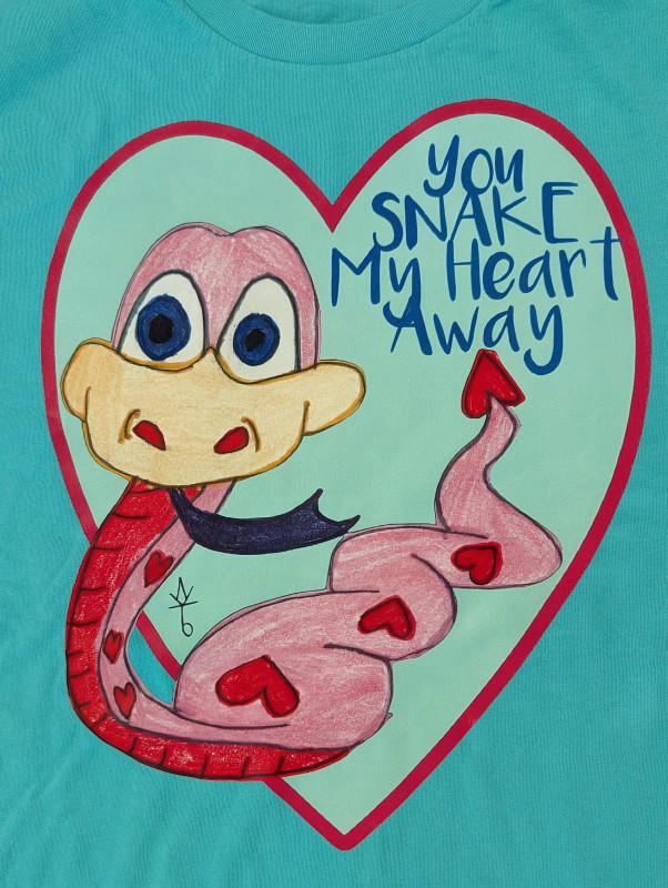 This exclusive shirt showcases my original artwork depicting a snake within a heart, available with two distinct messages. It is an ideal choice for snake enthusiasts and those seeking unique designs. The back neckline of the shirt features our logo for an added touch of authenticity.