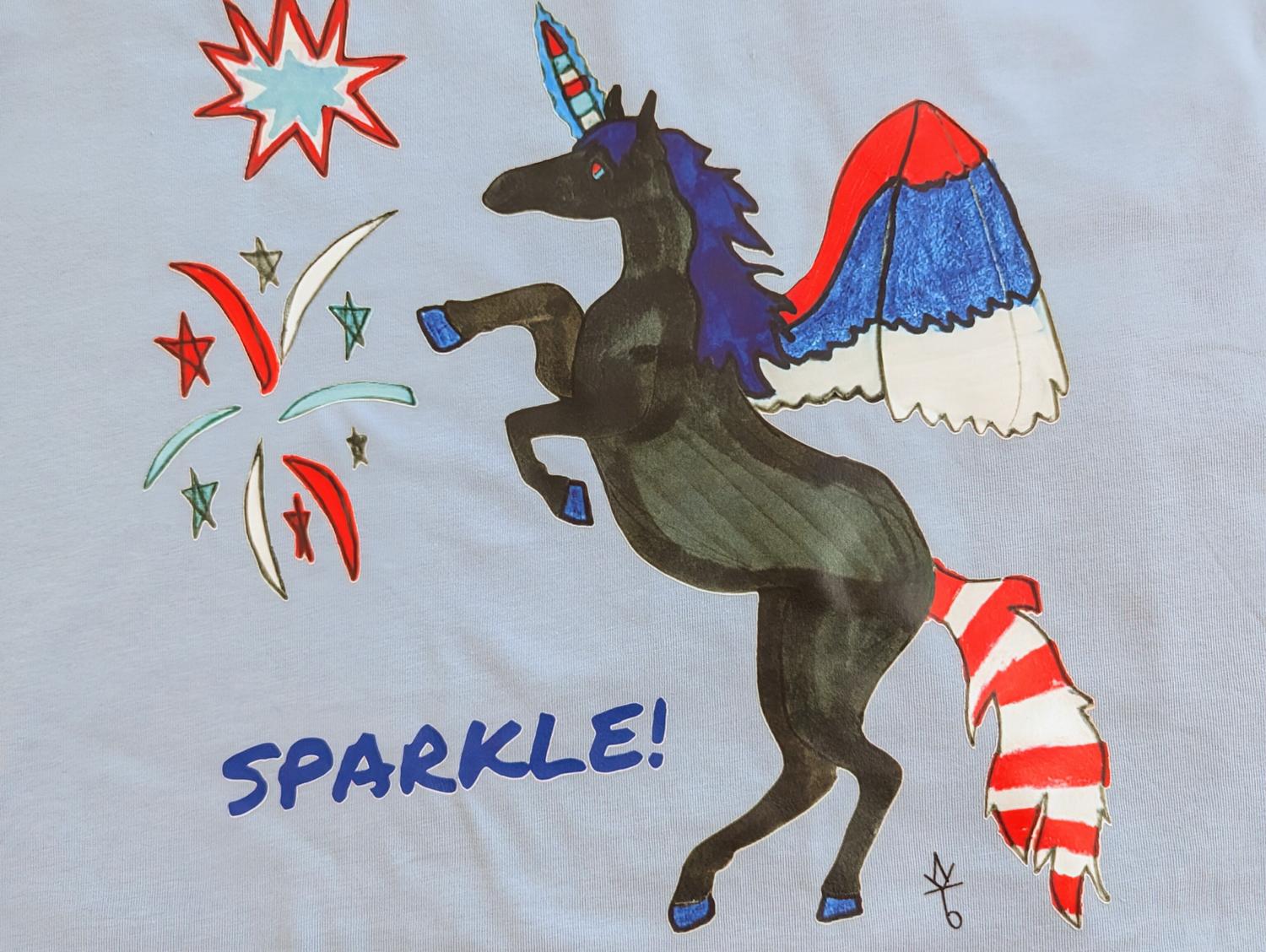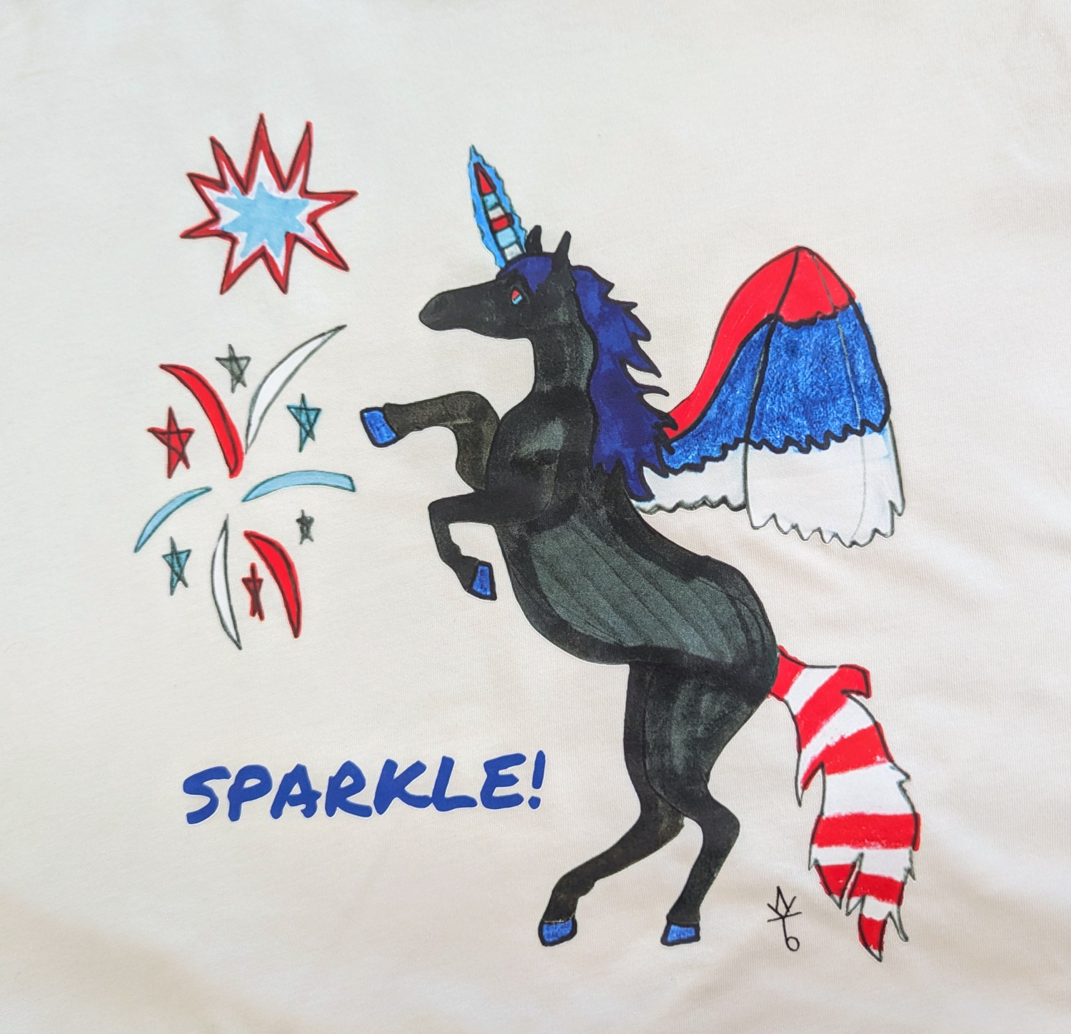 This shirt features my original 4th of July patriotic Alicorn design, with our logo on the back neckline.