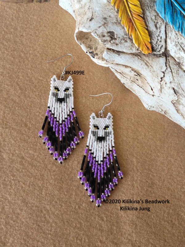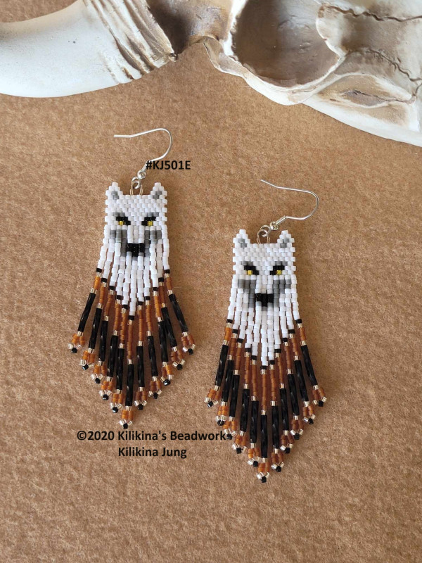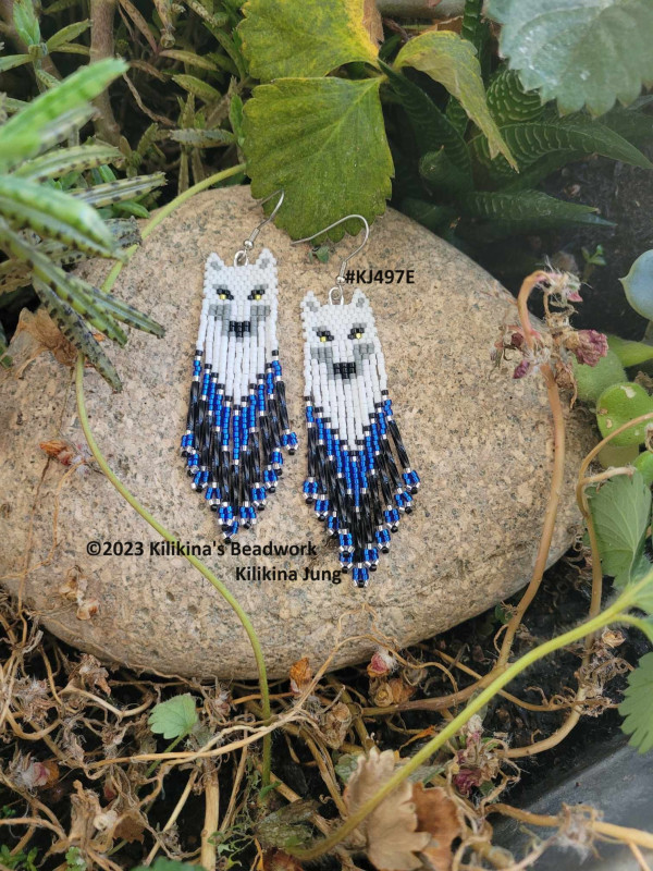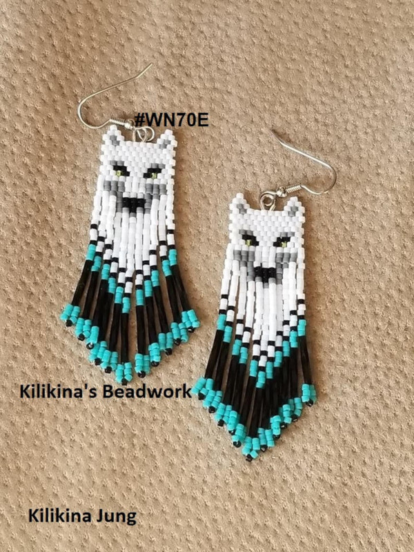 These Wolf earrings are made of seed beads - they measure about 3/4" wide and about 2 1/2" long (not including the hooks). The beadwork is hand sewn. These earrings are currently on stainless steel fishhooks. The fishhooks can be changed to posts or clips if requested. Buyer must request the change by message, before or when the item is purchased, as for I need to make any changes before packing and/or shipment.